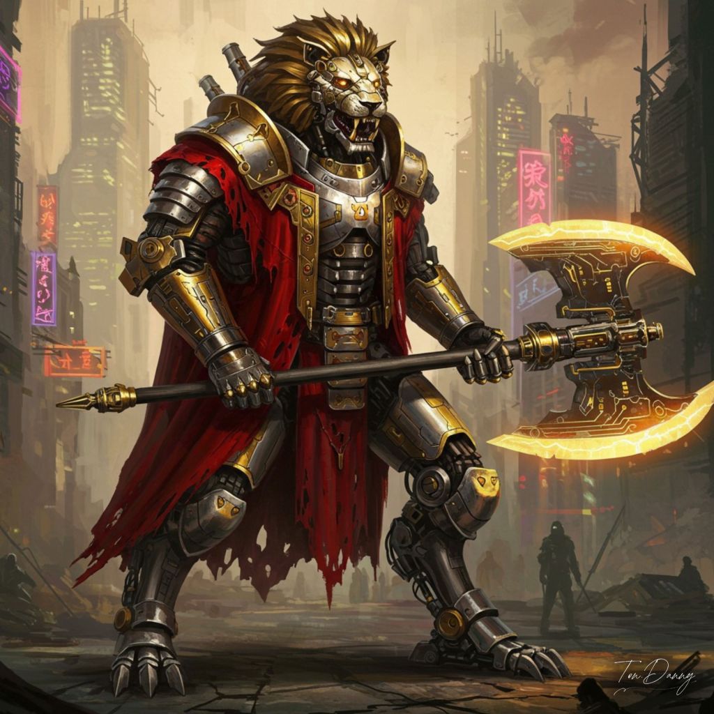 Oil Painting Beast-shaped Robot Cyberpunk Style The colossal, bipedal cybernetic lion warlord, its armored titanium-alloy frame reinforced with interlocking plated hydraulics and glowing amber energy cores, towers over the ruins of a fallen Cyberpunk metropolis. A regal crimson war robe, adorned with intricate golden circuitry and reinforced with layered cybernetic plating, drapes over its broad, machine-forged shoulders, shifting dynamically with every movement. Its mechanical faceplate, designed in the form of a majestic yet fearsome lion’s visage, features multiple overlapping armored layers, while its golden cyber-optics, powered by advanced AI-assisted combat scripts, flicker with predictive targeting algorithms. Each mechanized limb, constructed with high-torque servo motors and reinforced plasma dampeners, moves with calculated precision. In its massive reinforced gauntlets, the cybernetic lion grips a Cyberpunk Style Titan War Axe, a monolithic, double-bladed plasma weapon, its oscillating high-frequency edges leaving behind golden trails of energy. One hand grasps the hilt, while the other supports the weapon’s haft, ensuring optimal stability over the weapon’s immense power. The surface of the battle axe glows with intricate cybernetic glyphs, which shift dynamically, channeling stored energy into its devastating strikes. The gold-plated mechanical joints and segmented armor plating shift as the warlord takes a battle-ready stance, its tattered yet fortified red robe reacting to atmospheric changes, while embedded thruster vents release controlled bursts of electromagnetic discharge. Its tail-mounted plasma blade, lined with adaptive energy vents, flickers in synchronization with its core systems, primed for rapid counterattacks. As the digital skyline flickers, the city trembles under its sheer presence, emergency sirens failing as neon lights dim, consumed by the lion’s energy field. The ground cracks beneath its weight, and with a single downward swing of its colossal battle axe, an electromagnetic shockwave ripples outward, severing structures and destabilizing enemy forces. With each calculated step, kinetic stabilizers adjust dynamically, ensuring absolute balance and unshakable dominance on the battlefield. The golden inscriptions across its frame pulse, resonating with the remaining fragments of the corrupted cyber-city, as if commanding the last remnants of a forgotten digital empire.
