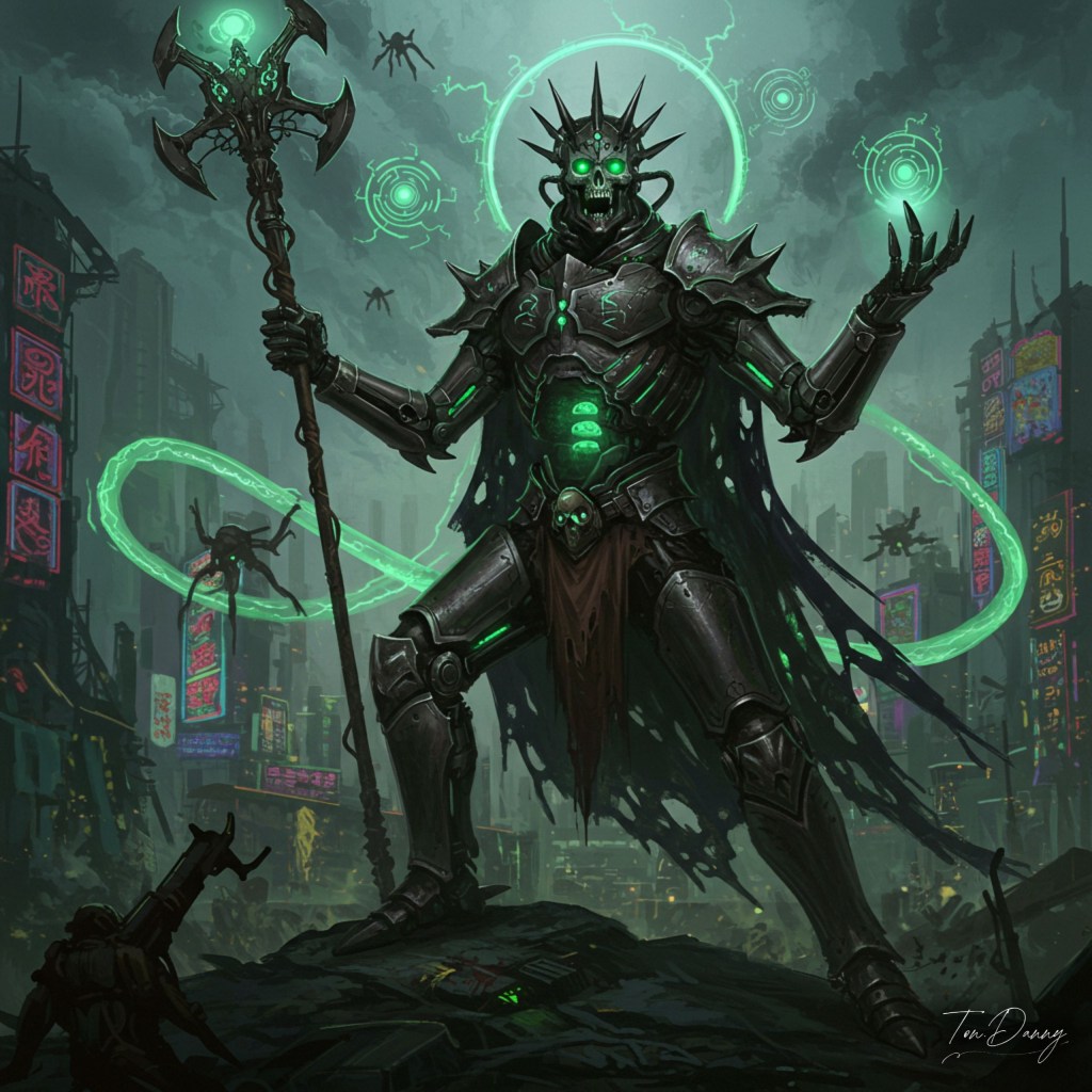 Oil Painting Lich-shaped Robot Cyberpunk Style The colossal, skeletal cybernetic emperor, forged from obsidian-black alloy plating and reinforced with industrial-grade servos and mechanical hydraulics, stands atop the ruins of a fallen Cyberpunk megacity, its monolithic frame crackling with erratic neon-green energy surges. Its skull-like visage, constructed from layered combat plating and reinforced sensor matrices, flickers with corrupted data streams, while glowing holographic sigils rotate in synchronized orbital formations around its chassis. Its multi-jointed mechanical limbs, reinforced with hydraulic pistons and segmented armor plating, twitch subtly as it adjusts its stance. From within its tattered, segmented nano-cloak, Cyberpunk Style Necro-Drones emerge, their high-frequency scanning beams cutting through the darkness, each drone equipped with adaptive plasma disruptors and spectral cloaking emitters. In its monolithic clawed gauntlets, it grips a Cybernetic War Staff, its core infused with an unstable fusion of AI-bound souls and volatile plasma energy. The oscillating energy tip of the weapon phases between physical and digital constructs, sending shockwaves of electromagnetic corruption through the battlefield. As it raises its fragmented mechanical hand, the entire city trembles, neon-lit skyscrapers flickering erratically as hijacked power grids overload and collapse into surges of unstable energy. Corrupted energy streams coil around its towering form, devouring the last remnants of civilization as its ancient subroutines execute their final annihilation sequence.