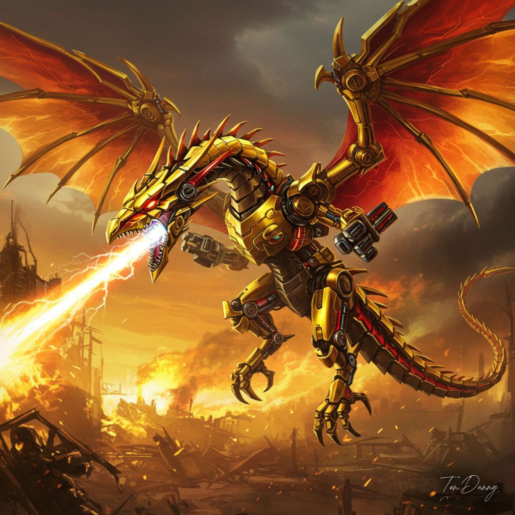 Oil Painting Wyvern-shaped Robot Cyberpunk Style The sleek, golden and crimson cybernetic wyvern, its multi-layered mechanical wings composed of interlocking heat-resistant plates, soars above a blazing Cyberpunk wasteland. Its armored frame gleams, reflecting the distant flicker of collapsing skyscrapers, while its reinforced cybernetic talons flex, primed for a strike. From its reinforced jaw, a Cyberpunk Style Solar Flare Cannon ignites, releasing a controlled wave of plasma-infused solar energy that distorts the very air around it. Its wing-mounted stabilizers rotate dynamically, maintaining balance as the wyvern dives through the sky, incinerating its foes below.