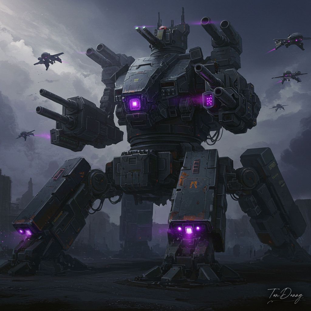 Oil Painting Fortress-shaped Robot Cyberpunk Style The colossal cybernetic fortress, constructed from midnight-black industrial plating and glowing violet energy cores, stands as the final line of defense for the last Cyberpunk stronghold. Its towering sentry turrets, lined with Cyberpunk Style Fusion Cannons, rotate methodically, scanning the horizon. The central AI core, embedded within its reinforced citadel structure, pulses as it deploys swarms of automated combat drones, each designed for precision air-to-ground suppression. Beneath the fortress, its mechanized foundation shifts, revealing hidden weapon platforms, preparing for an all-out counterattack.