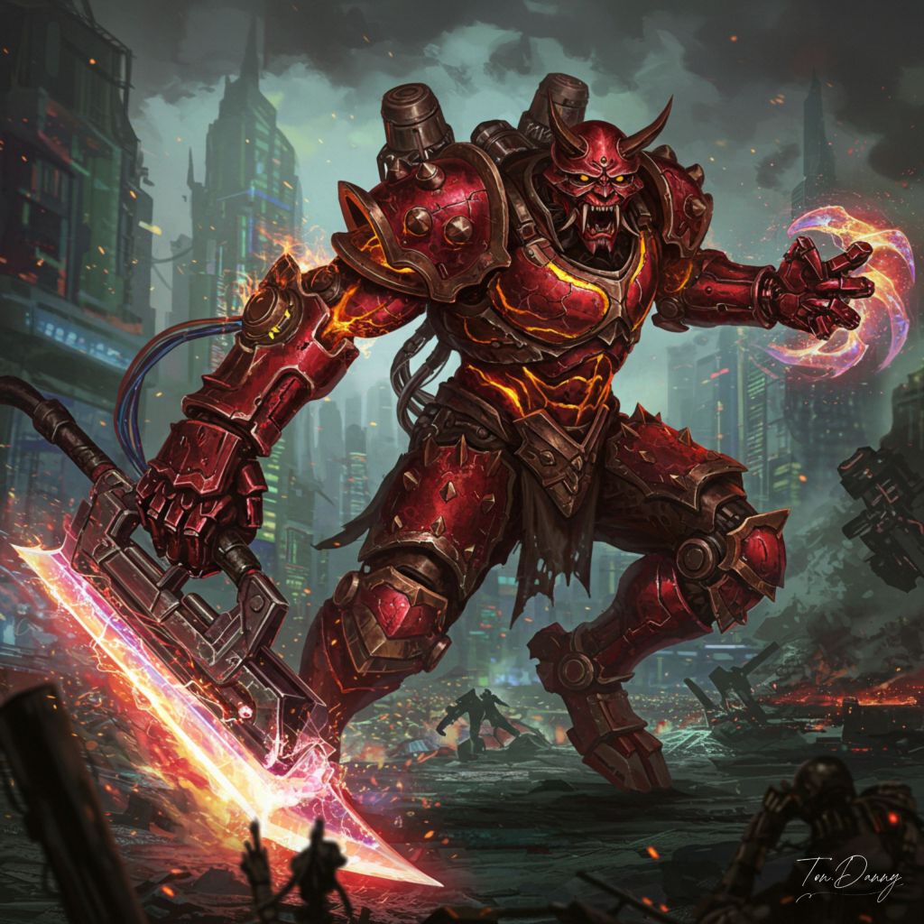 Oil Painting Oni Berserker-shaped Robot Cyberpunk Style The hulking cybernetic oni, its burning crimson armor scorched with plasma scars, lets out a digitally distorted roar as it smashes through a holographic skyline. Its clawed gauntlets, lined with oscillating blade generators, hum with stored energy, ready to rend anything in its path. As it charges, its back-mounted thrusters ignite, sending it rocketing toward its next victim. Its Cyberpunk Style Plasma Cleaver, lined with unstable energy conduits, vibrates violently as it prepares to cleave through reinforced barriers and steel alike. The battlefield trembles beneath its rage, a force of pure destruction set loose upon the digital warzone.