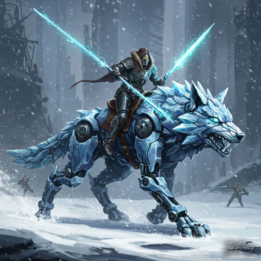 Oil Painting Wolf Rider-shaped Robot Cyberpunk Style The massive, ice-blue cybernetic wolf, its reinforced chassis lined with crystalline nano-filament plating, sprints across a frozen Cyberpunk wasteland, its breath leaving behind trails of supercooled mist. Upon its spine, a lone cybernetic knight, clad in frost-encrusted steel alloy, grips a Cyberpunk Style Energy Lance, ready to strike. As the duo charges through the ruins of a forgotten city, the wolf’s eyes glow with arctic luminescence, tracking enemies through shifting snowdrifts. The rider’s stabilizers adjust dynamically, compensating for sudden terrain changes. With a final leap, they launch themselves into battle, the knight’s lance igniting as it pierces through the storm.
