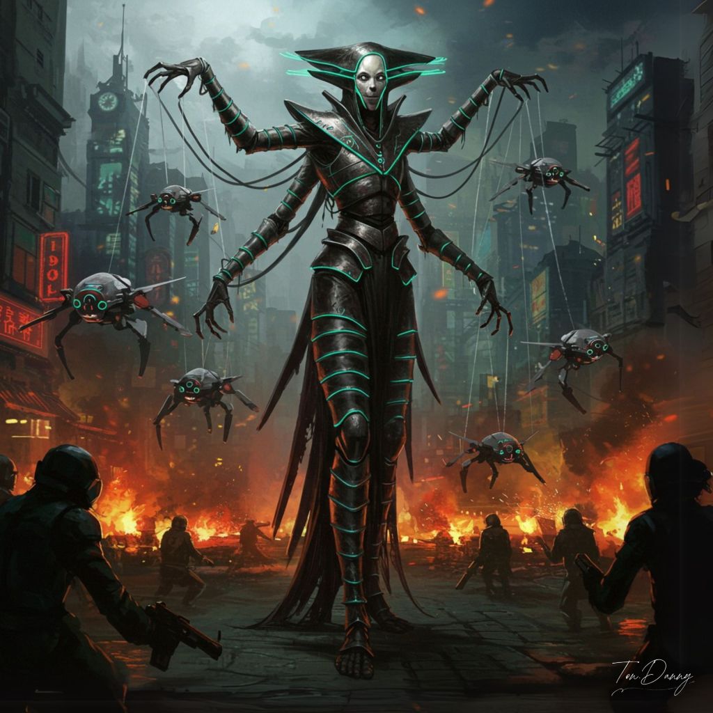Oil Painting Puppet Master-shaped Robot Cyberpunk Style The tall, eerie cybernetic entity, clad in a segmented exoskeleton lined with silver threads of neon-lit fiber optics, manipulates the battlefield with floating mechanical marionettes, their glowing eyes flickering in synchronization. Each wire-thin appendage, extending from the entity’s back-mounted cyber-core, controls a Cyberpunk Style Combat Drone, which moves fluidly, reacting to its master’s every command. As the city trembles beneath its influence, the master’s hidden scythe-like blades extend, ready to join the fray.