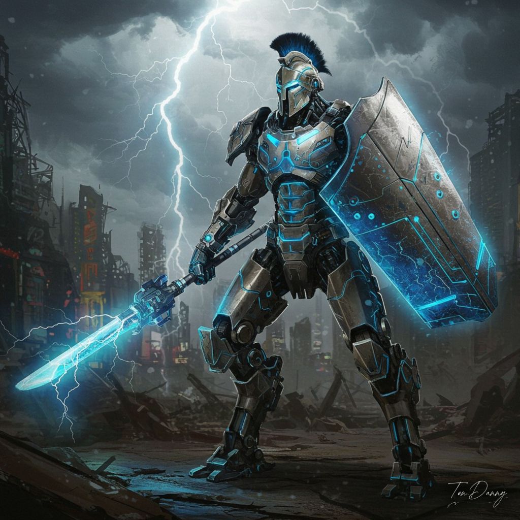 Oil Painting Spartan-shaped Robot Cyberpunk Style The monolithic cybernetic warrior, clad in reinforced titanium alloy and shimmering blue plasma circuitry, marches through the wreckage of a fallen Cyberpunk utopia. Its massive shield, lined with holographic energy barriers, deflects enemy projectiles effortlessly. In its free hand, a Cyberpunk Style Thunder Spear crackles with ionic discharge, surging with enough power to shatter reinforced battle mechs with a single thrust. As the storm clouds gather above, the Spartan stands firm, its mechanized joints locking into a defensive stance, ready to protect what remains of the city.