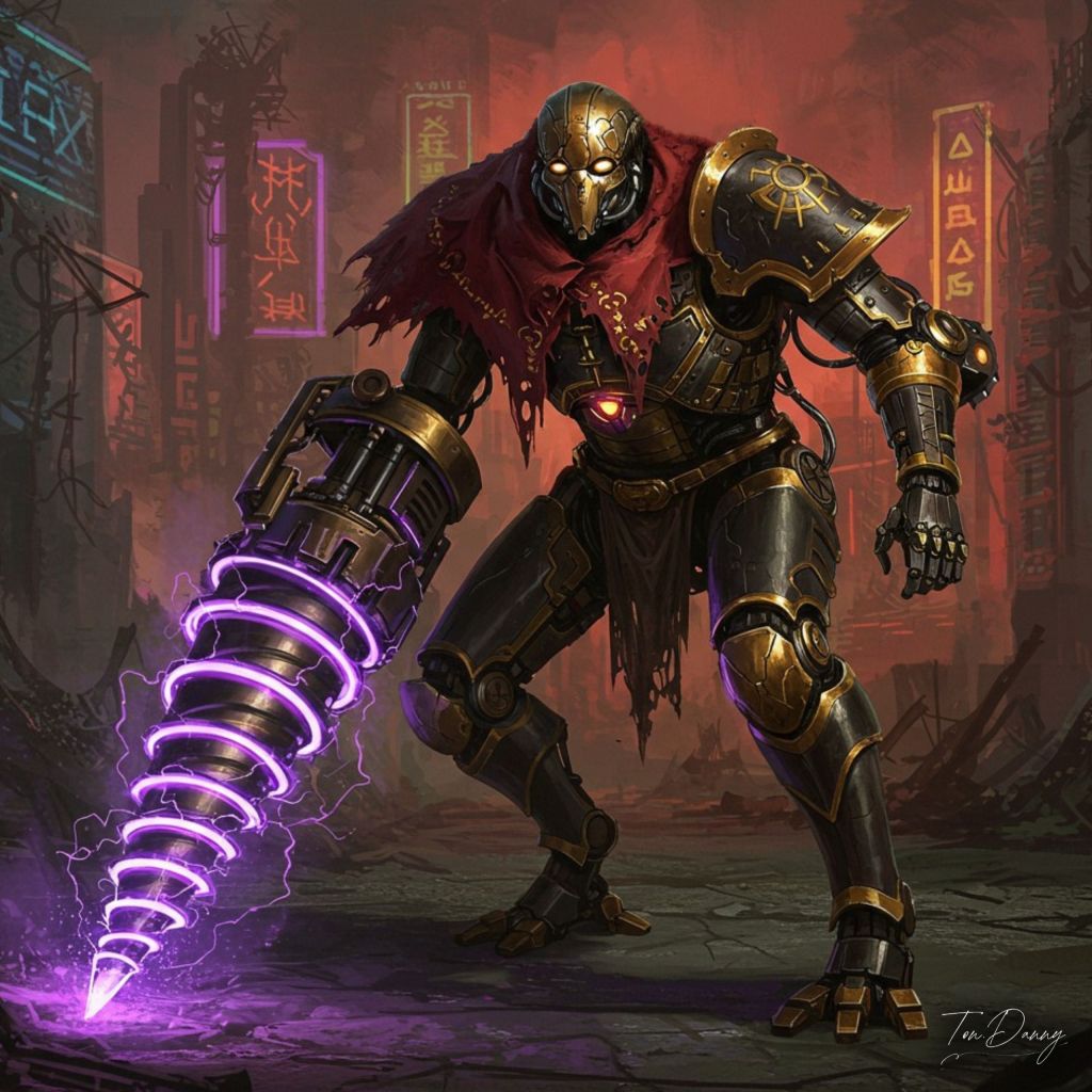 Oil Painting Drill-armed Robot Cyberpunk Style. Amid the ruins of a collapsed neon metropolis, a colossal humanoid war-machine assumes a poised, battle-ready stance—its knees slightly bent, frame tilted forward as if measuring the moment before a charge. Its obsidian-black and gold-lined armor gleams under fractured neon, layered with reinforced plating over high-torque servos. Embedded across its chest and joints, amber power cores pulse in ritual cadence—cybernetic hearts feeding every calculated movement. Its right arm ends in a massive cybernetic drill, forged from concentric alloy rings interlocked with angular precision, each segment glowing with volatile hues of violet and cobalt plasma. The drill is held behind the machine, angled low and back in a coiled position—like a weapon not yet unleashed, but already radiating destructive authority. Though retracted, its spiraling energy illuminates the air around it, casting curved shadows and spectral reflections across the broken terrain. The war-machine’s shoulders are crowned with a tattered crimson cloak, embroidered with golden conductive veins and ceremonial seals. Its faceless golden mask features a single vertical slit glowing with measured judgment, crowned with antennae shaped like fractured halos. Around its legs and back, kinetic stabilizers hiss with electromagnetic discharge, anchoring the titan as it braces for movement. It does not raise its weapon. It does not roar. It waits, crouched— and the drill behind it hums with promise: the strike will not be seen, only felt.