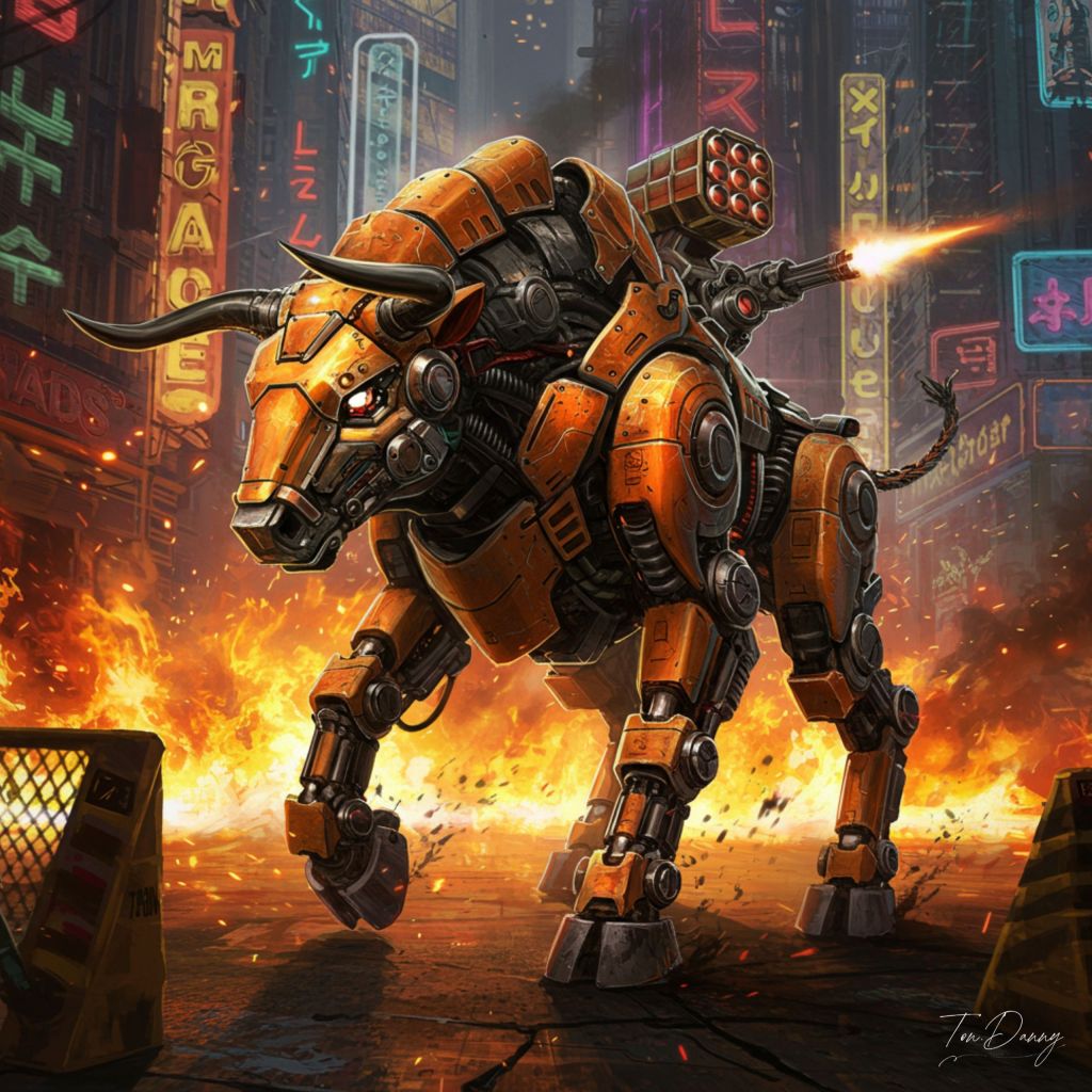 Oil Painting Beast-shaped Robot Cyberpunk Style A massive quadrupedal combat beast, shaped like a mechanized bull, charges through a flaming city district. Its armor glows orange from internal heat, and plasma exhausts along its flanks pulse in sync with its hooves, which crack the concrete with each step. Its head mounts dual ion blasters in place of horns, and its back carries a barrel-fed missile rack, launching precision blasts as it thunders forward. Neon signs explode in its wake as it smashes through corporate barricades.