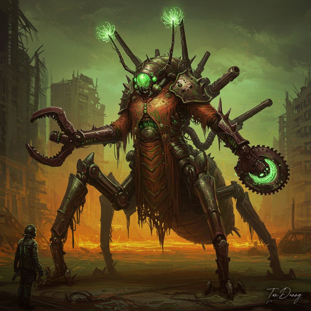Oil Painting Insectoid-shaped Robot Cyberpunk Style This towering arthropod mech lumbers through the acid-lit wastefields of a collapsed district, its dozens of armored legs clattering with magnetic force. Its segmented thorax pulses with sickly green bioluminescence, while its upper body mimics a human torso wrapped in a robe of armor-spines and gas-filtration coils. In place of hands, it wields clamp-like plasma shredders that unfold into chains of circular saws. From its back rise twin energy cannons disguised as antennae, each launching swarms of nanite-stingers to paralyze and infect opposing systems.