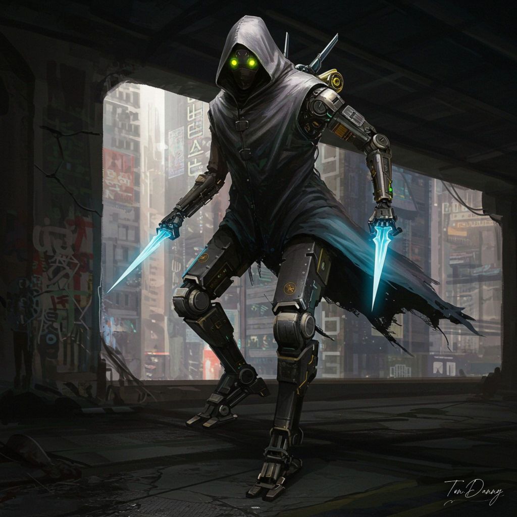 Oil Painting Thief-shaped Robot Cyberpunk Style Sleek and agile, this mech stalks the elevated highways of a collapsed district, draped in a distortion-field cloak made from reflective nanofiber. Twin mono-molecular daggers extend from under-forearm compartments, glowing faintly with data-venom meant to paralyze other AIs. Its feet are magnetized for silent vertical traversal, and its AI processor is loaded with stealth routines stolen from military prototypes. It leaves no heat, no light—only silence and flickering screens in its path.