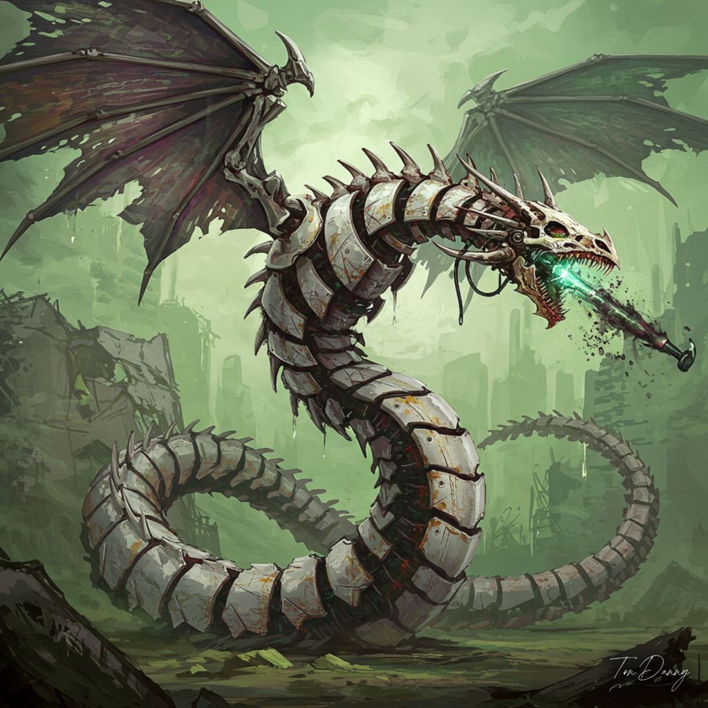 Oil Painting Dragon-shaped Robot Cyberpunk Style The serpentine robot coils around the ruins of a shattered arcology, its skeleton-like frame reinforced with rusted white armor etched with corroded circuitry. Segmented wings, composed of blade-like data plates, leak toxic vapor as they unfold. A long drill-like jaw, lined with plasma injectors, expels virulent black mist laced with nanomachine toxins. From its back, servo-linked spines vibrate, releasing shrill data-waves that fracture nearby defense networks. The polluted sky glows faint green from the spread of airborne corrosion.