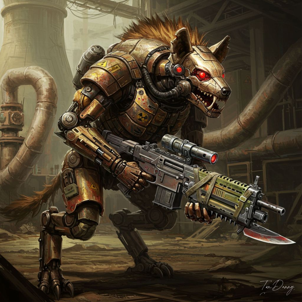 Oil Painting, Beastman-shaped Robot, Cyberpunk Style. In the decaying heart of a long-dead reactor complex, a heavily mechanized beast-shaped cybernetic war machine, modeled after a hyena, prowls the skeletal remains of twisted pipelines and shattered coolant towers. Its chassis is a complex matrix of rusted servo-plates, shock-resistant alloy ribs, and layered mechanical musculature, flexing with compressed pneumatic hiss and hydraulic tension at every movement. The faceplate—shaped like a hyena’s snarling skull—is fitted with jagged intake fans and ventilators, constantly recycling airborne chemical waste through a sealed filtration system embedded in its throat cavity. Red-tinted lenses blink in rapid succession, scanning for motion, heat, and signs of corrupted fuel. Gripped tightly in its reinforced forelimbs is a cyberpunk-style rifle, massive and brutal. The weapon combines compressed-air cocking mechanisms, magnetic rail chambers, and a vicious bayonet affixed beneath the barrel—forged from reclaimed carbon-blade tech and wrapped with glowing glyph-circuitry. The gun’s body is etched with reactor warning sigils, and its ammo drum pulses faintly with toxic-green glow. Amber exhaust gas vents from its oxidized joints with every step. Its back hums with internal gyros and retractable armor fins, while cooling rods flick open from its flanks to shed built-up radiation. Beneath its armor, fiber-optic tendons and kinetic stabilizers shimmer faintly with charge. The core engine in its chest glows a sickly orange, flickering behind fractured blast glass and plated shielding. The mech doesn’t roar— it hisses, stalks, and aims. Not a guardian. Not a soldier. But a reclaimer of the dead zone’s silence.