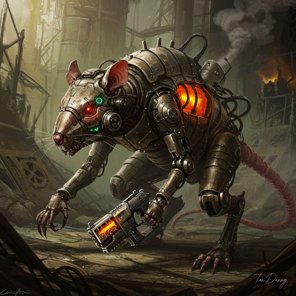 Oil Painting, Soul-like Cyberpunk Style. Amid the irradiated wreckage of a collapsed reactor district, a highly mechanized rat-shaped combat unit creeps through a maze of corroded coolant conduits and shattered control towers. Its chassis is a dense lattice of exposed cabling, jointed alloy rods, and overlapping rust-eaten armor plates, hissing and twitching with servo corrections as it moves. Pneumatic cables snake across its limbs, while articulated toe-joints grip debris-strewn terrain with calculated efficiency. Its head resembles a gas-masked rodent skull, layered with sensor arrays and thermal-optic lenses embedded in rotating sockets. Air-filter canisters and micro-fan units buzz along the jawline, constantly venting noxious vapor in rhythmic pulses. Data ports and tracking beacons flicker beneath the surface like neon parasites. Gripped in its clawed mechanical hand is a compact, cyberpunk-style pistol—composed of modular alloy plates, glowing capacitor tubes, and a thermal overdrive coil that hums with barely-contained heat. The weapon features plasma-glyph etchings, and its targeting scope projects digital reticles across shattered walls and warped steel. A flickering reactor core, encased behind segmented armor ribs in its abdomen, pulses with decaying orange light—its energy regulation erratic, unstable, and dangerous. Auto-stabilizers line its spine, adjusting posture with each breath of seismic vibration. Its tail is segmented, semi-rigid, tipped with a retractable spike antenna for battlefield uplinks. This machine is not stealthy by nature—but by ruin. It moves with scavenger purpose, prey-aware and processor-cold. In silence, it hunts heat signatures. In smoke, it breathes memory.