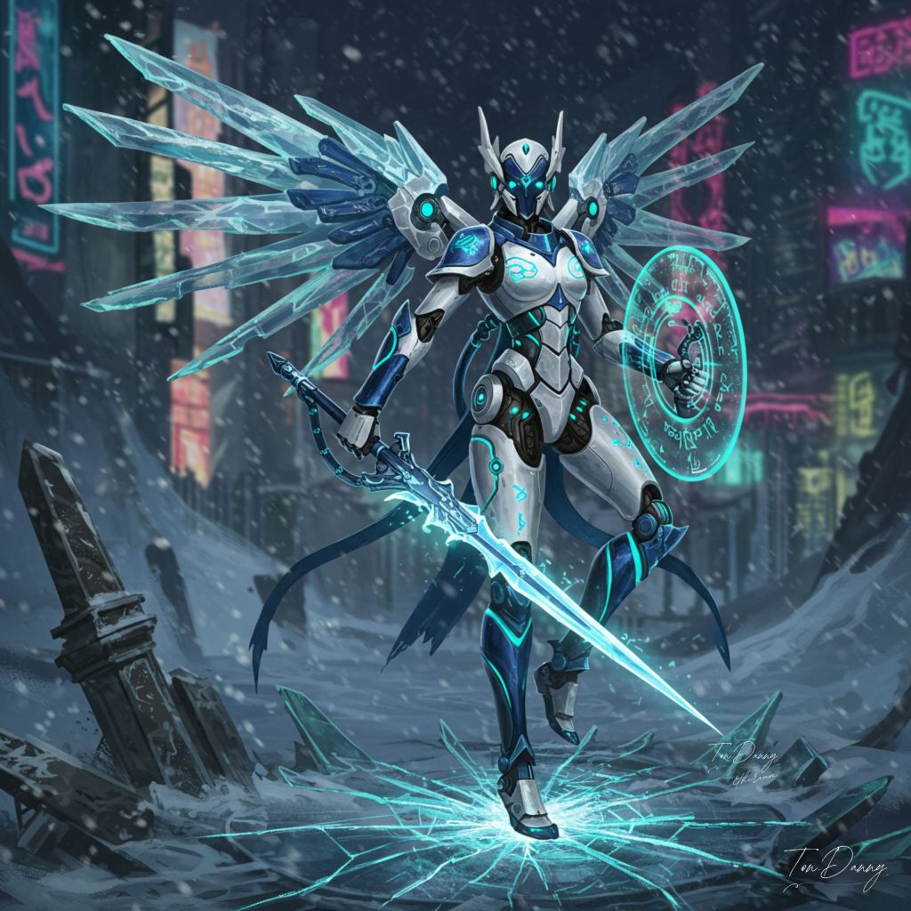Oil Painting Valkyrie-shaped Robot Cyberpunk Style The robot stands poised atop a shattered glass monument, her sleek yet heavily armored White and Sapphire Blue body composed of segmented mechanical plating, accentuating her feminine silhouette. Glowing cyan energy conduits run visibly along her limbs and torso, forming intricate, glyph-like patterns. In her right hand, she holds an elegant Cyberpunk Style Plasma Rapier, its blade ultra-thin and needle-like, glowing with concentrated blue plasma energy designed for precision thrusts. The rapier’s hilt features intricate mechanical detailing, with rotating energy cores and glowing accents that pulse faintly with every movement. Her left arm projects a circular energy shield, its transparent surface adorned with spinning mechanical runes and glowing circuits. Her angular mechanical wings, designed to resemble delicate, interlocking shards of ice, emit freezing plasma trails from glowing thrusters embedded along their edges, moving with fluid, precise articulation. Her headpiece, resembling a Valkyrie’s helmet, is sleek and aerodynamic, with glowing blue optics framed by subtle mechanical details and rotating targeting sensors. Her legs are slender yet reinforced with hydraulic joints and glowing stabilizers, their articulated design combining agility and grace with mechanical strength. The ground beneath her is cracked and frosted, illuminated by scattered shards of shattered glass and glowing particles radiating from her icy aura. The background reveals a frozen Cyberpunk cityscape with towering neon-lit spires and swirling snow, the glowing lights reflecting off her polished armor and accentuating her divine yet industrial presence.