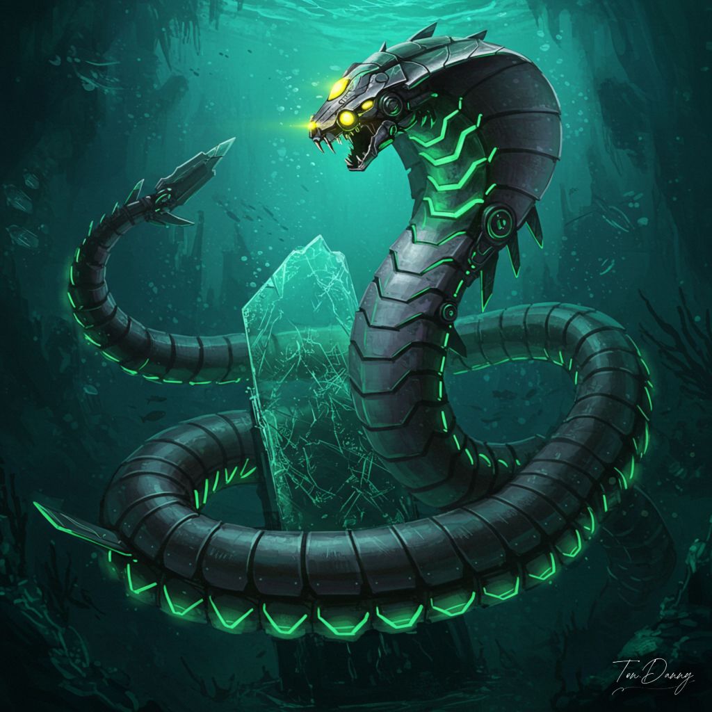 Oil Painting Serpent-shaped Robot Cyberpunk Style The robot coils around a shattered glass monument submerged in an inky abyss, its segmented Gunmetal Gray and Neon Green body glowing faintly with energy lines that pulse like a heartbeat. Its head is angular and sharp, with glowing yellow optics and serrated plasma jaws, while multiple mechanical fins and thrusters run along its back for swift underwater propulsion. The background reveals a deep Cyberpunk ocean trench illuminated by bioluminescent holograms and eerie green neon lights.