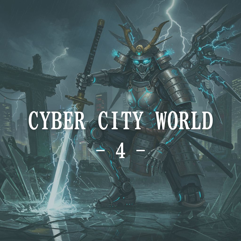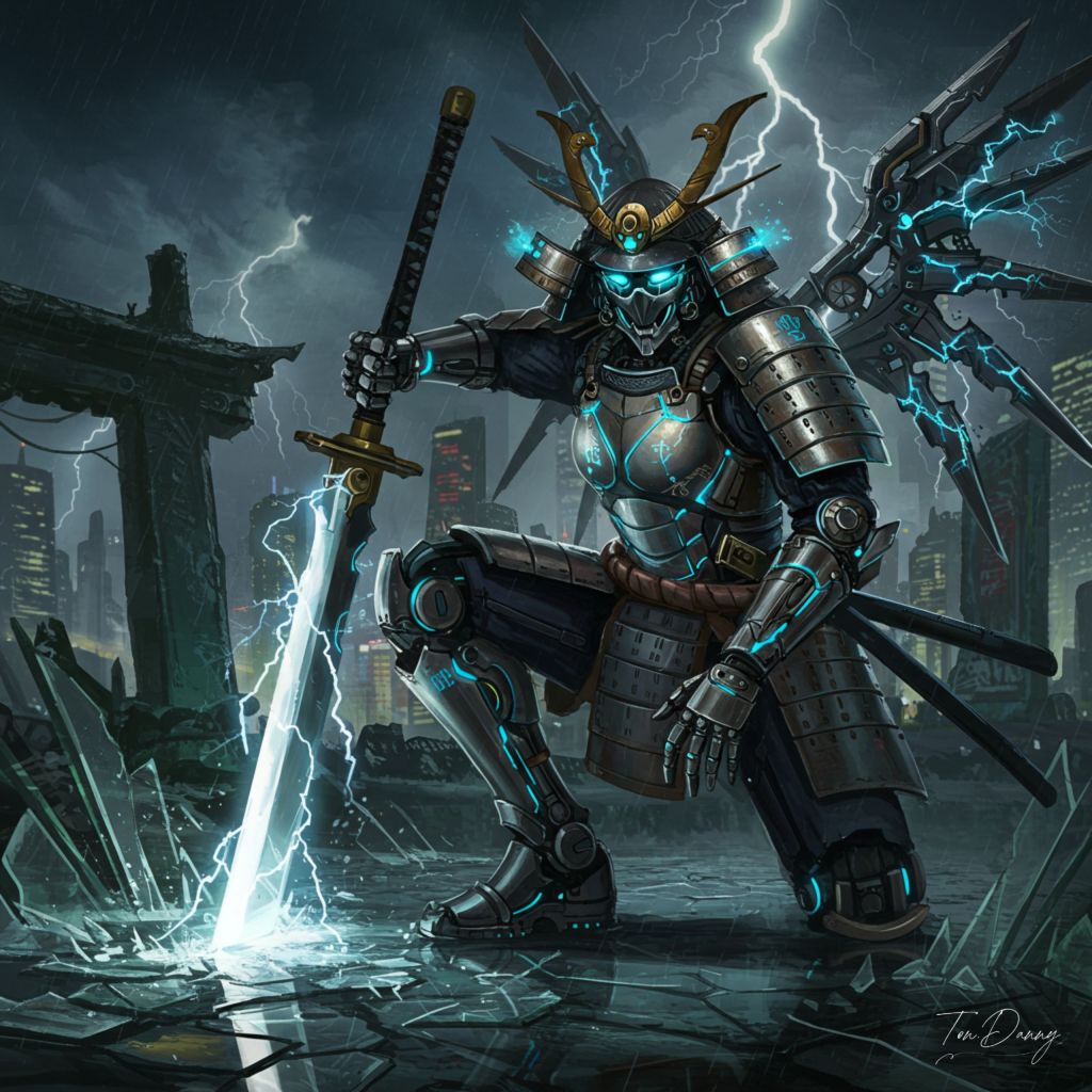 Oil Painting Samurai-shaped Robot Cyberpunk Style The robot kneels with one knee pressed against a shattered glass monument, her heavily armored Gunmetal Gray and Electric Blue body glowing with circuit-like patterns. She wields a massive Cyberpunk Style Plasma Katana, its blade sparking with lightning energy as it hums with destructive power. Her headpiece resembles a samurai’s kabuto with glowing blue accents, and her mechanical wings are reinforced with sharp-edged turbines emitting electric arcs. The background shows a stormy Cyberpunk cityscape, lightning illuminating the darkened skyline and reflecting off her polished armor.