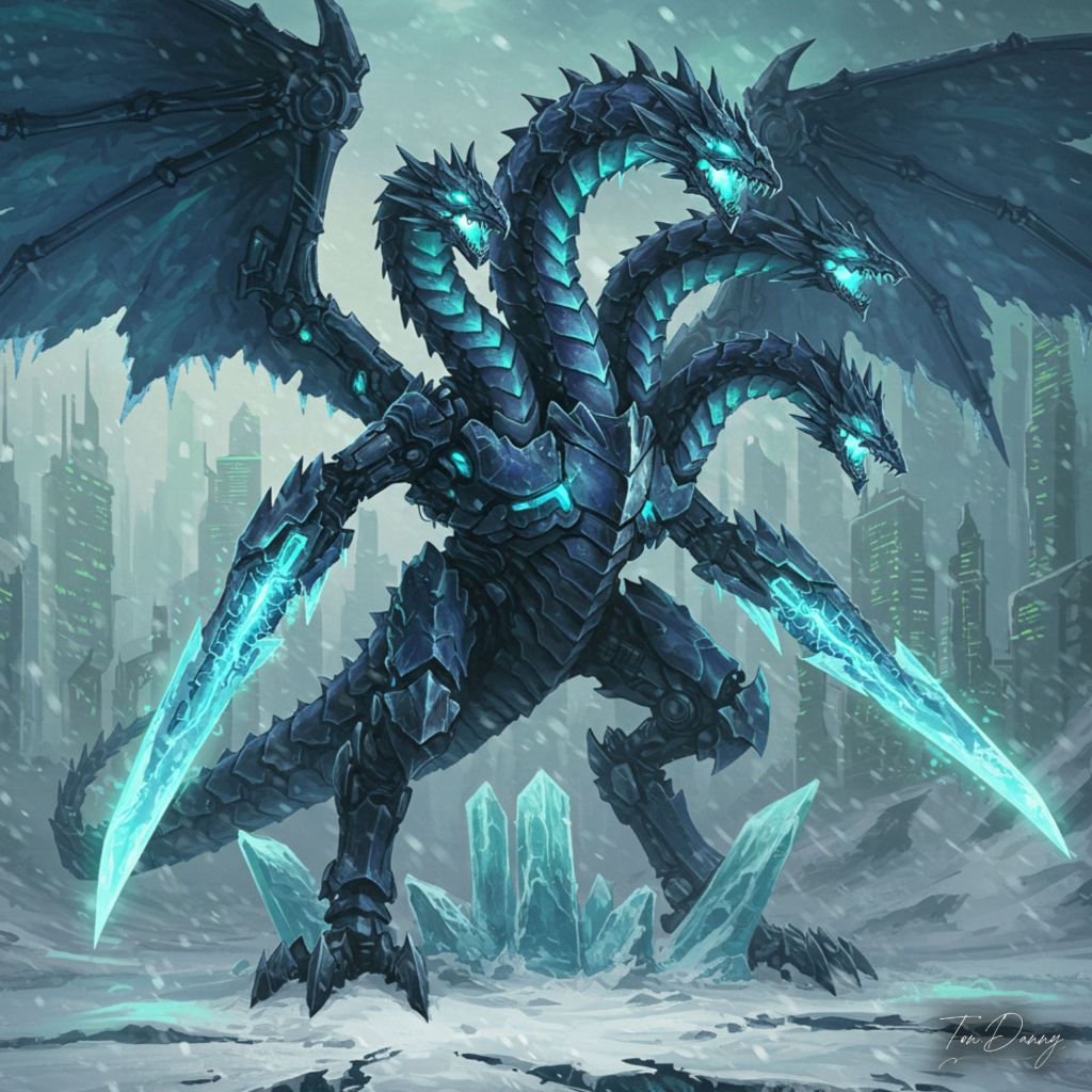 Oil Painting Dragon-shaped Robot Cyberpunk Style The robot towers over an icy glass monument in a frozen wasteland, its massive Steel Blue body reinforced with interlocking mechanical plates and glowing cyan energy conduits running visibly along its segmented frame. Its five angular, hydra-like heads feature glowing cyan visors and sharp plasma-edged jaws, each exhaling freezing mist that crystallizes the air around them. The heads are connected to the central body by heavily reinforced necks lined with articulated armor and glowing power conduits, allowing for independent movement and coordination. Its massive mechanical wings are jagged constructs with interlocking frost-coated panels, housing powerful frost jets that emit freezing plasma mist in precise bursts. The claws on its four massive, grounded legs are plasma-frost blades, glowing faintly and leaving trails of icy cracks on the frozen ground. The legs are heavily armored, with visible hydraulic joints and stabilizers glowing faintly as they support its immense weight. Along its back, rows of sharp, blade-like spines emit pulses of cold energy, creating a shimmering frost aura. The background features a frozen Cyberpunk cityscape, with towering structures glowing faintly in pale neon blues and greens, while swirling snow and icy winds whip through the desolate landscape, framing the massive hydra in an apocalyptic, mechanical silhouette.