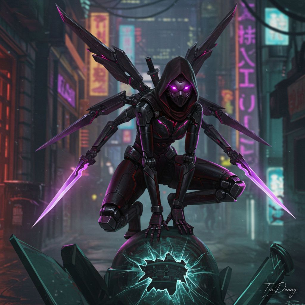 Oil Painting Ninja-shaped Robot Cyberpunk Style The robot crouches in the shadows atop a shattered glass monument, her sleek Black and Crimson body reinforced with lightweight, segmented armor designed for stealth and agility. Her glowing violet optics peer through a sharp, angular mask, while her arms hold twin plasma daggers glowing with faint purple light. Her mechanical wings are compact and sharp-edged, equipped with retractable thrusters for sudden bursts of movement. The background reveals a dimly lit Cyberpunk alley, with neon signs flickering in the fog and holographic projections casting eerie shadows.