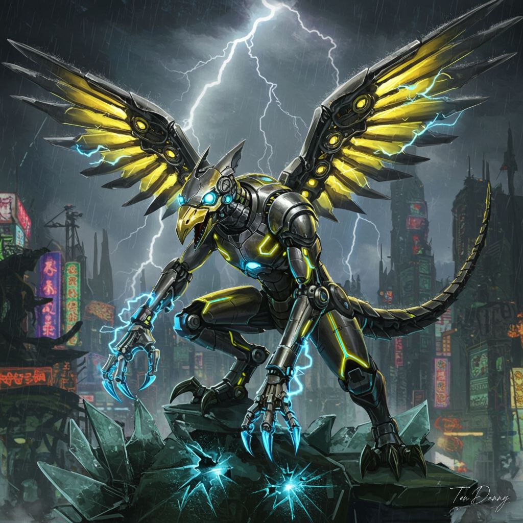 Oil Painting Raptor-shaped Robot Cyberpunk Style The robot crouches low on a fractured glass monument, its sleek Gunmetal Gray and Electric Yellow armor accented by glowing energy lines. Its mechanical wings are sharp and angular, lined with plasma vents that emit arcs of electricity. The claws are massive and glowing with blue plasma energy, and its sharp, bird-like head features glowing optics that pierce the stormy surroundings. The background shows a Cyberpunk city under a violent storm, lightning reflecting off the robot’s polished armor.