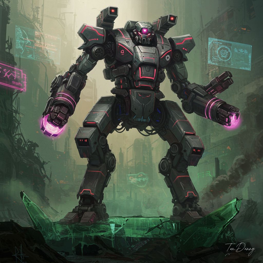 Oil Painting Demon-shaped Robot Cyberpunk Style The robot strides forward from a shattered molten glass monument, its massive body composed of densely packed, interlocking mechanical components, blending jagged Black armor with exposed inner workings glowing with vibrant purple and green plasma conduits. In its right hand, it wields a colossal Cyberpunk Style Plasma Revolver, its barrel adorned with glowing green energy rings and intricate, glyph-like patterns, while the chambers emit faint purple light, charging with each motion. The clawed left hand is articulated with retractable plasma blades, shimmering with green and purple energy, ready to strike with precision. The mechanical wings are massive, jagged constructs, formed from sharp, interwoven metallic panels housing glowing plasma thrusters, emitting spiraling trails of purple and green mist. The robot’s angular head is crowned with asymmetrical horns; one sleek and polished with embedded plasma cores, glowing green, and the other jagged, formed from salvaged components, radiating ominous purple light. Its multi-lens optics glow alternately with intense purple and green, surrounded by rotating targeting sensors and articulated apertures, scanning its surroundings with cold precision. The torso is a chaotic fusion of advanced power cores and salvaged parts, protected by segmented, glowing armor plates that pulse rhythmically with unstable plasma energy. Its legs, slender yet reinforced with hydraulic pistons and visible stabilizers, end in taloned feet that scorch the ground with every step, leaving molten impressions behind. The revolver’s barrel emits faint heat waves, and as it points forward, glowing plasma projectiles form, radiating an aura of destruction. The background depicts a dystopian Cyberpunk cityscape in chaos, with crumbling neon-lit skyscrapers and jagged orange fissures splitting the molten terrain. Columns of smoke rise into the air, distorted by waves of heat, while holographic warning symbols flicker, casting shifting purple and green light across the robot’s intricate frame, amplifying its menacing and apocalyptic presence.