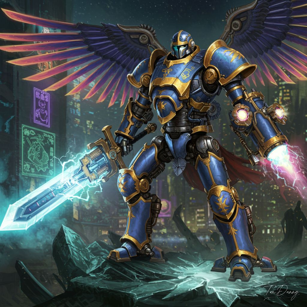 Oil Painting Knight-shaped Robot Cyberpunk Style The robot stands heroically on a shattered glass monument, its massive Silver and Sapphire Blue armor glowing with golden energy conduits. It wields a colossal Cyberpunk Style Energy Sword, the blade segmented with rotating plasma cores and glowing with intense blue light. The mechanical wings on its back are designed for high-speed propulsion, their thrusters leaving trails of radiant energy. The background reveals a glowing Cyberpunk skyline, neon holograms reflecting off swirling mist.