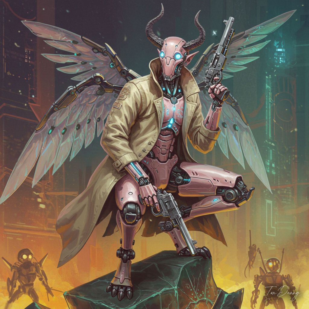 An oil-painted cyberpunk scene featuring a demon-shaped robot with a strikingly elegant and refined aesthetic, crouching gracefully atop a shattered molten glass monument. Unlike its battle-hardened counterparts, this mechanized entity exudes a sense of sophisticated beauty, its sleek pastel pink and ivory-white exoskeleton composed of intricately interlocking mechanical plates with delicate, lace-like engravings. The plasma conduits embedded throughout its form glow with a soft lavender and ethereal blue, pulsing like a gentle heartbeat rather than a war machine’s destructive core. Draped over its form is an intricately designed, high-tech beige trench coat, its hem flowing as if woven from digitized silk, adorned with subtle holographic embroidery that shifts between floral and cyber runes. The robot’s arms, designed with a blend of sleek plating and delicate mechanical filigree, hold a pair of exquisitely crafted cybernetic plasma revolvers, their barrels trimmed in silver, humming softly with restrained energy. Its mechanical wings, a fusion of ornate industrial design and feather-like panels, extend outward in an array of interlocking titanium and ceramic components, each lined with softly glowing plasma conduits that emit gentle golden and pastel-blue energy trails. Articulated appendages at the lower wings hold holographic ribbon-like energy extensions, fluttering as if caught in an unseen breeze, further emphasizing its graceful yet otherworldly presence. The robot’s head, crowned with elegant asymmetrical metallic horns—one smoothly curved and emitting a warm golden glow, the other angular with a soft lavender shimmer—tilts slightly as it scans the cybernetic battlefield with serene yet commanding optics. Around its neck, a delicate silver-plated energy conduit necklace flickers gently, amplifying its ethereal radiance. On its feet are sleek natural beige propulsion stabilizers, resembling ballet flats with integrated kinetic absorption technology, allowing it to hover gracefully over the cracked battlefield without disturbing the molten terrain. Resting atop its head is a straw-woven cybernetic halo, a futuristic reinterpretation of an angelic crown, embedded with micro-holographic projectors displaying intricate, constantly shifting patterns. The background reveals a stunning contrast between chaos and elegance—a sprawling cyberpunk wasteland transitioning into a ruined cityscape with neon lights flickering like distant stars. Amidst the destruction, holographic cherry blossoms drift through the air, remnants of a forgotten digital utopia. Ethereal golden warning symbols hover around the robot, not as cautionary alerts but as an aura of mystic protection, reinforcing its presence as a guardian of beauty within an apocalyptic world.