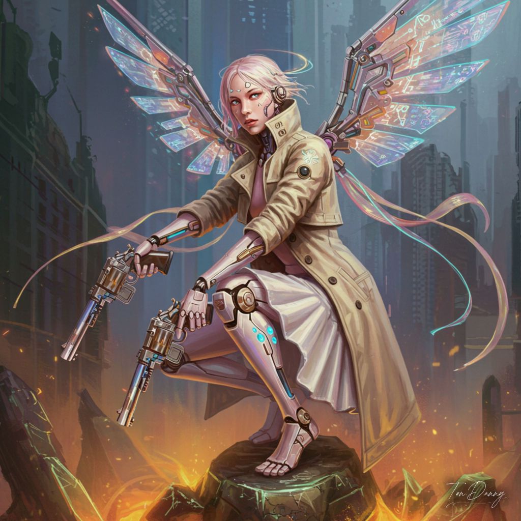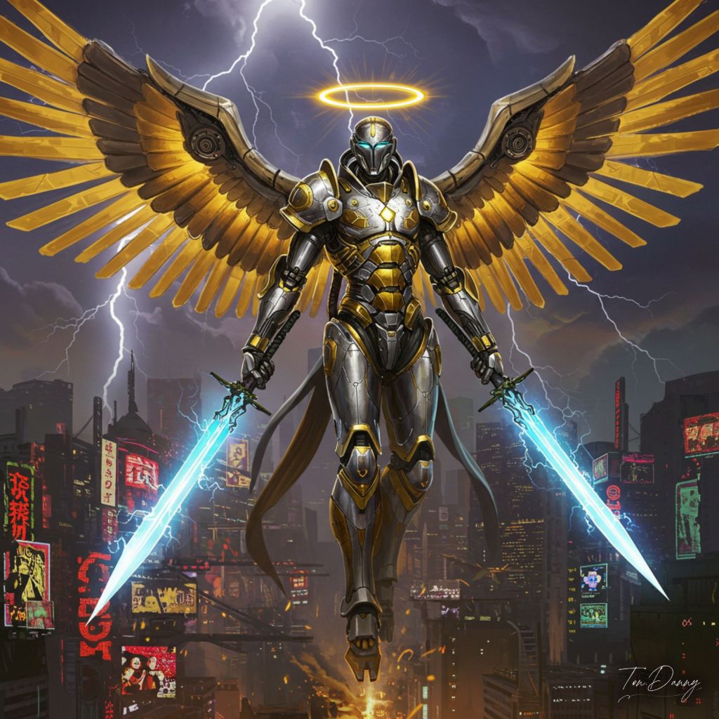 Oil Painting Angel-shaped Robot Cyberpunk Style The colossal, silver and gold cybernetic archangel hovers above a Neo-Tokyo-inspired Cyberpunk skyline, its armored exoskeleton constructed from reinforced mechanical plating, etched with pulsing celestial circuits and energy conduits. Multi-layered, rotating energy halos float behind its head, emitting waves of radiant digital energy. Its massive mechanical wings, composed of segmented golden alloy plates interwoven with jet-powered stabilizers and retractable plasma fins, spread wide, releasing a symphony of glowing thruster trails and electromagnetic pulses. Each wing segment features intricate mechanical actuators, adjusting dynamically to its flight patterns. In its reinforced cybernetic grasp, the Cyberpunk Style Photon Lance hums with unstable plasma energy, its blade shifting between pure photonic energy and a high-frequency plasma edge, designed to shred through both digital constructs and reinforced matter. Along its forearms, additional kinetic stabilizers and heat-dispersing vents glow faintly, regulating the immense power coursing through its body. Above, thunder rumbles through the digital heavens, lightning streaking across a sky filled with malfunctioning neon signs and flickering holograms, as the guardian prepares to descend with overwhelming force, its presence distorting the very fabric of the city’s electronic grid.