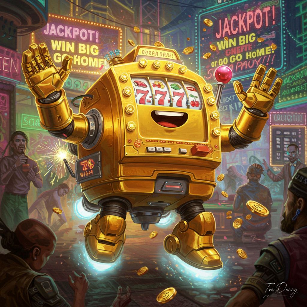An oil-painted cyberpunk scene featuring a gold-plated, flashy, and slightly gaudy mascot robot designed as a futuristic slot machine. Its round, chubby body gleams with obnoxiously bright gold, covered in neon pink and electric blue LED accents that flicker like a glitchy casino sign. The robot’s face is a giant, animated jackpot reel, constantly spinning between 777, neon cherries, and pixelated gold bars, occasionally flashing cartoonish winking eyes and a wide, mischievous grin. Its stubby, mechanical arms have oversized, jewel-encrusted fingers—one waving wildly, the other dramatically pulling its own lever-like arm. Instead of legs, the bot hovers just above the pavement, propelled by a noisy, sparking engine that spits out holographic dollar signs and floating gold coins as it moves. Small exhaust vents on its back randomly shoot out glitter and confetti, adding to its over-the-top presence. The background is a loud, chaotic cyberpunk casino district, drenched in clashing neon colors, with massive holographic billboards flashing “JACKPOT! WIN BIG OR GO HOME!” in looping animations. Neon-tinted fog swirls around seedy gamblers, cyborg hustlers, and desperate casino-goers, all entranced by the glowing, obnoxiously cheerful slot-bot. A cybernetic dealer, dressed in a tacky sequined suit, watches with an amused smirk as the bot belches out golden tokens at lucky winners while flashing a giant “CONGRATS, SUCKER!” sign above its head. The whole scene radiates a frenzied, tacky Vegas-meets-Cyberpunk energy, blending excessive glitz with a slightly shady, underworld vibe. The robot, with its obnoxious golden sheen and overly animated expressions, is both irresistibly charming and hilariously over-the-top, embodying the chaotic thrill of high-stakes gambling in a neon dystopia.