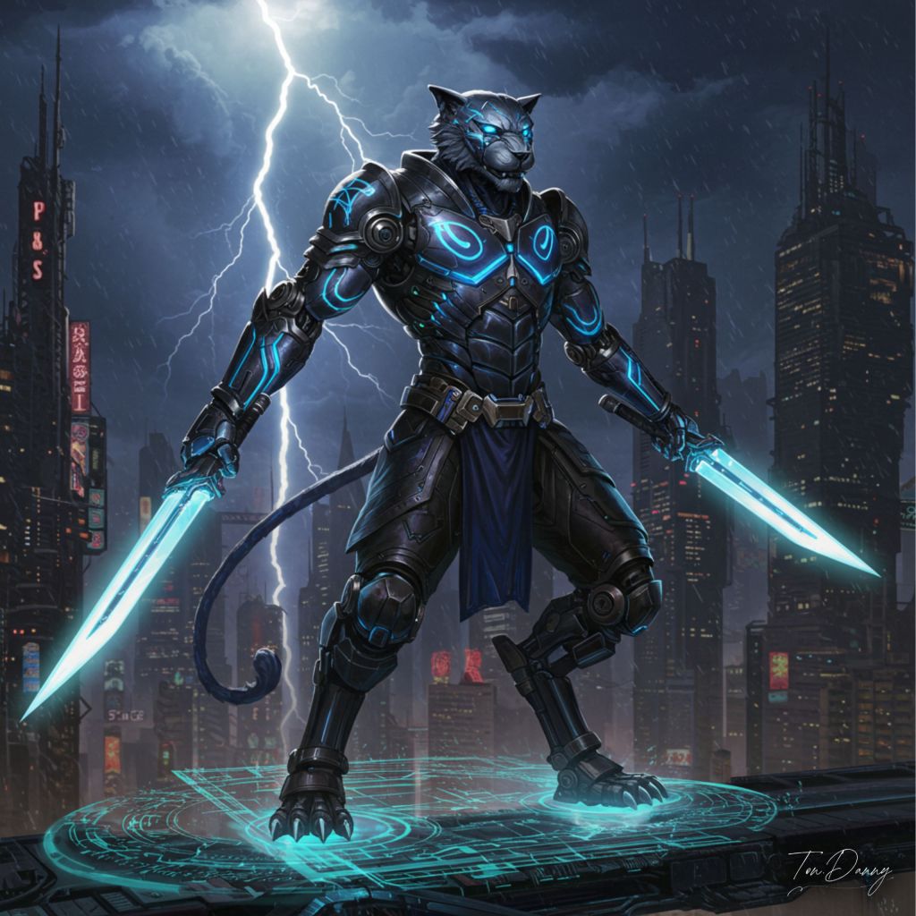 Oil Painting Beastman-shaped Robot Cyberpunk Style The towering, panther-like cybernetic warrior, clad in sleek onyx and sapphire-blue alloy, stands poised atop a flickering holographic bridge in a dystopian metropolis. Its glowing tribal markings, etched into its reinforced chest plates and mechanical gauntlets, pulse rhythmically. In its clawed hands, it wields a Cyberpunk Style Dual Energy Sabers, their blades shifting between hardlight and plasma mode. Its jet-powered mechanical tail, lined with stabilizer thrusters, allows for rapid aerial maneuvers. Lightning streaks through the stormy sky, illuminating its silhouette as it prepares to engage in battle.