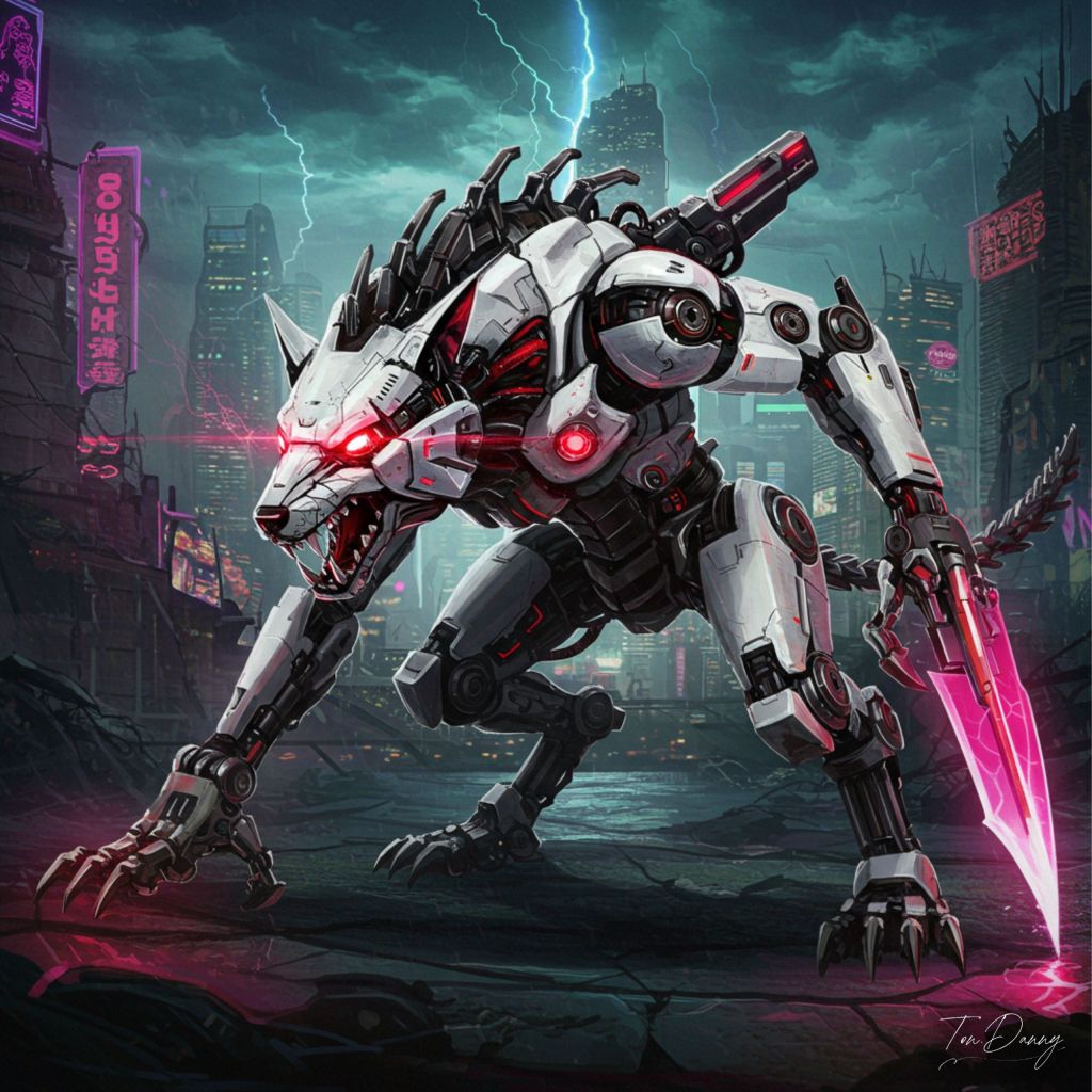 Oil Painting Beast-shaped Robot Cyberpunk Style The massive, cybernetic wolf-like machine, cloaked in white and gunmetal plating, prowls across the neon-lit ruins of a Cyberpunk city. Glowing cybernetic sinews and reinforced titanium joints give it a predatory stance, its optics flickering between crimson and electric blue as it scans for its next prey. A Cyberpunk Style Plasma Blade, extending from its reinforced mechanical tail, hums with kinetic energy. Its clawed forelimbs, equipped with vibrating energy emitters, allow it to slice through reinforced alloy like paper. In the background, storm clouds gather, reflecting the neon glow of the fractured skyline.