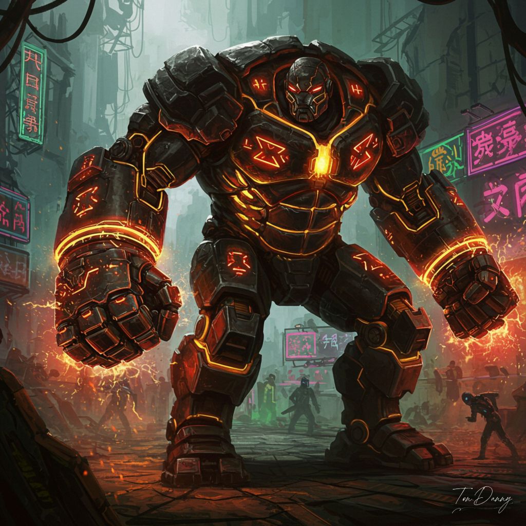 Oil Painting Golem-shaped Robot Cyberpunk Style The colossal, obsidian and fiery gold cybernetic golem, forged from reinforced industrial plating, stands amidst a ruined Cyberpunk megastructure. Its heavyset form, reinforced with energy-infused alloy segments, emanates seismic waves with every step. Its massive fists, integrated with Cyberpunk Style Shockwave Generators, glow with overloaded plasma energy, distorting the air around them. Neon-lit symbols pulsate across its monolithic torso, reacting dynamically to its power output. As it raises its arm, the ground itself fractures, neon signs shattering as the battlefield shifts beneath its might.