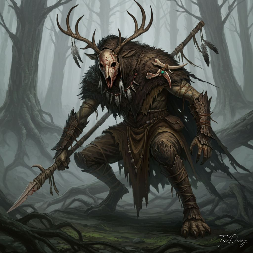 “Oil painting, Soul-like Eastern style, Dark fantasy atmosphere. A beastman warrior with the lithe, silent body of a forestborn deer crouches among fog-shrouded trees, its limbs sinewy and bark-like, gnarled with ancient scars. Draped across its shoulders flows a massive cloak of dark bear pelts, heavy with rain and ritual smoke, trailing bone beads and scorched feathers that sway with every ghostlike step. Its chest and limbs are covered in armor pieced together from cracked bark, sharpened antlers, and fossilized bone, bound in place with rawhide cord and stitched prayer-fibers. The armor is not forged—it is grown and remembered. Adorning its frame are totem fragments, spirit bells, and sun-dye beadwork woven into the fur lining—signs of a shamanic bloodline etched in silence. Its face is hidden behind a long, antlered wooden mask, carved in the grotesque likeness of a wailing infant. From a single slit, one bloodshot eye stares, unblinking. In its gnarled hands, it clutches a bone-tipped spear, wrapped in rotting prayer-cloth and braided sinew. The roots beneath it twitch. The fog parts only when it chooses. It does not speak. It remembers. And when it strikes, it does so like a curse whispered by the woods themselves.”