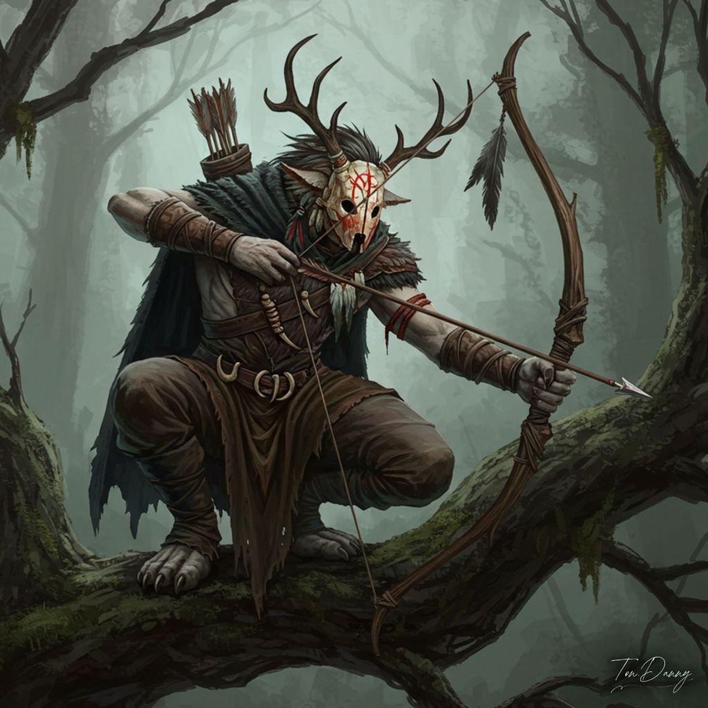 “Oil painting, Soul-like Eastern style, Dark fantasy atmosphere. Perched high among the twisted limbs of an ancient tree, a pale-furred beastman crouches in perfect stillness. His body is cloaked in dense, matted fur, and his dominant arm—thick with wild muscle and streaked with old scars—pulls back the string of a massive longbow carved from petrified rootwood. The bow creaks softly under the tension, strung with ghost-sinew that hums with ancestral memory. His face, hidden behind a cracked stag-mask bound with crimson sinew, peers down with a single bloodshot eye—locked on unseen prey below. Feathers, beads, and bone charms sway gently from his armor of bark and fossil-bone plates. A heavy cloak of black bear pelts hangs from his shoulders, draped like a forgotten banner across the branch. Around him, the forest holds its breath. Not a leaf moves. His arrow—tipped with carved ancestral bone and fletched with spectral feathers—glows faintly in the mist. He does not speak. He does not rush. He waits. And when he looses, history remembers.”