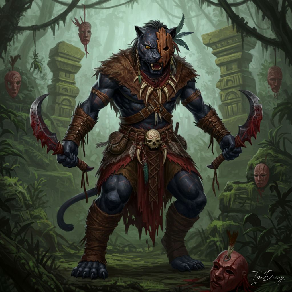 “Oil painting, Soul-like Eastern style, Dark fantasy atmosphere. A panther-like beastman prowls the moss-draped ruins of an ancient jungle shrine, his obsidian-black fur slicked with ceremonial oil that gleams beneath dying shafts of templelight. His face is hidden behind a splintered wooden mask, one side shattered to expose a snarling jaw and a single glowing amber eye—not burning with rage, but with ritual purpose. Across his sinewy frame, he wears ritual armor of interlaced bark plates and bleached bone, etched with claw-mark runes and bound with sinew cord. From his waist hang totem charms, feathered glyphs, and fang-carved beads that sway like muted chimes in the dense air. Draped over his shoulders flows a weather-darkened mantle of deep red bear fur, its hem singed and engraved with storm symbols—not a garment, but a memory worn in war. In both hands, he wields twin hooked knives, carved from volcanic horn and obsidian, their edges blackened with ancient blood. Each blade arcs like a crescent verdict, and each strike is an invocation. He does not roar. He arrives as silence does—too late to stop. Around him, discarded masks hang from vines like flayed memories, whispering in tongues only the dead recall. He hunts not to kill. He hunts to remember.”