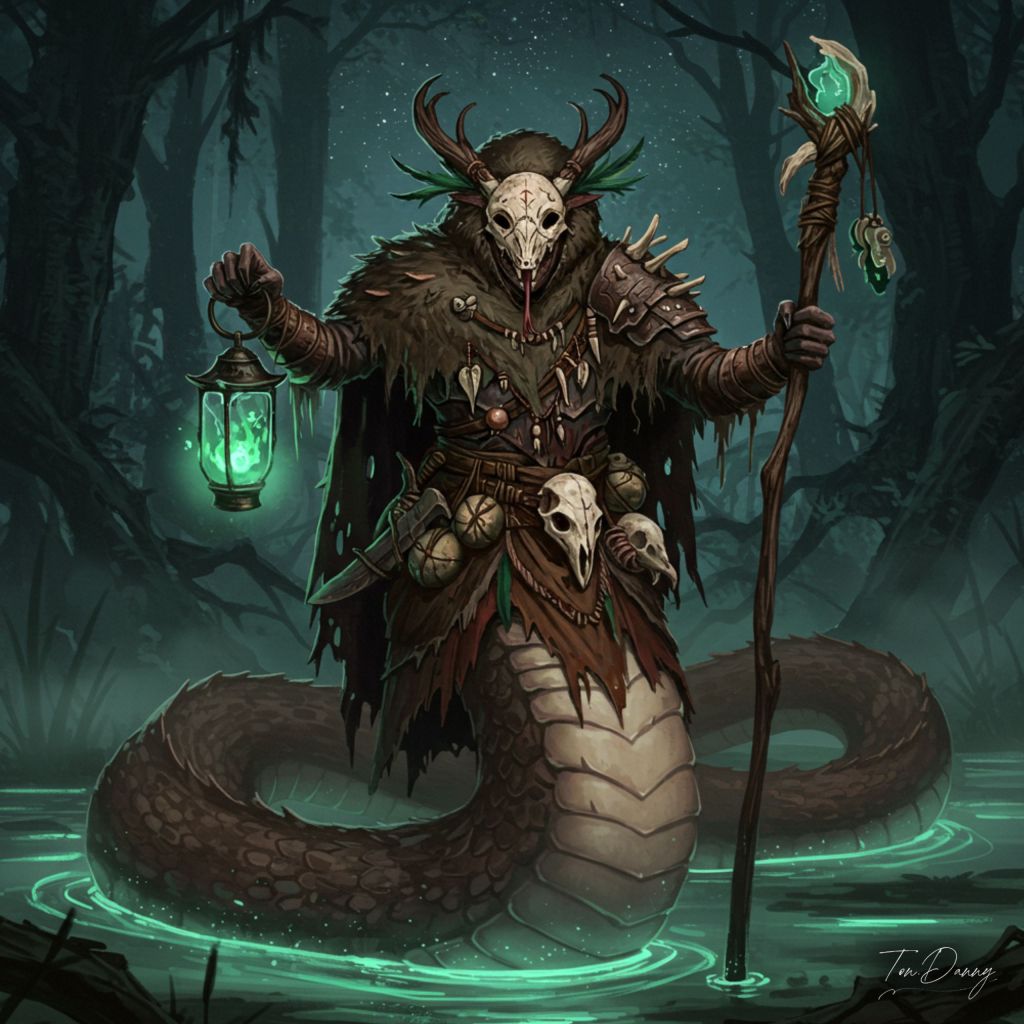 “Oil painting, Soul-like Eastern style, Dark fantasy atmosphere. A serpentine beastman slithers silently through a starlit mire of glowing, stagnant water. His scaled body coils in ritual rhythm, adorned with layered armor made from fossilized bark and sun-bleached bone, etched with storm sigils and lashed with sinew cords. From his shoulders drapes a massive cloak of weather-darkened bear fur, trailing moss, crow feathers, and ceremonial beadwork that jingles like distant memory. His face is obscured by a serpent-skull mask, half-fused to his head by resin and fungal rot, its eye sockets glowing faintly with ancestral light. Braided fetishes, bone charms, and sun-dyed talismans hang from his neck and arms like an ancient priest’s altar given flesh. In one hand, he lifts a lantern of cracked glass, inside of which writhing moths of green flame flutter like cursed spirits. In the other, he grips a crooked staff crowned with a spiral bone spine, humming with rotbound power. His hissed incantations are older than language—poisonous syllables handed down by the drowned dead. Wherever he passes, trees lean away. Insects fall still. The fog thickens, and the water forgets how to ripple. He is not the serpent. He is the curse that taught serpents how to speak.”