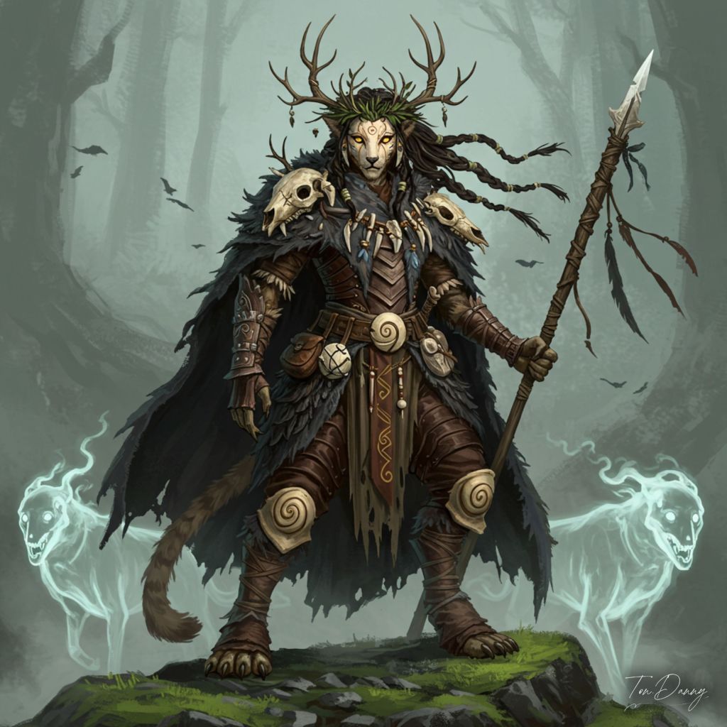 “Oil painting, Soul-like Eastern style, Dark fantasy atmosphere. A tall, feline beastwoman stands solemnly atop a moss-draped outcrop, cloaked in the hush of sacred winds. Her body is clad in armor forged from bleached bone plates and bark-layered leather, bound with sinew and etched in spiral runes. Her figure is regal, fierce—a living monument to forgotten bloodlines. Draped across her shoulders flows a mantle of dark bear fur, soaked in storm-smoke and decorated with beaded tassels, crow feathers, and dyed hide fragments inscribed with sun-marks and storm-glyphs. Every motion of the cloak stirs the wind like a ritual performed in silence. Her mask—carved from polished ivory into the serene visage of a deer—conceals burning yellow eyes that pierce like judgment. Upon her brow rests a crown of living leaves intertwined with carved bone charms and woven spirit-symbols, fluttering softly in the mist. In her hands, she wields a long ritual spear, its haft wrapped in vine-cord and bark, its tip a crystalline fang that glows with ancient druidic energy. The air hums in response to its presence. When she throws, the wind obeys. By her side run three ghost-hounds formed of fog and bone, their forms flickering like memories too sacred to fade. They leave no tracks. They make no sound. She is not a war-chief. She is the oath that guards the grove. And mercy was never written into its stones.”