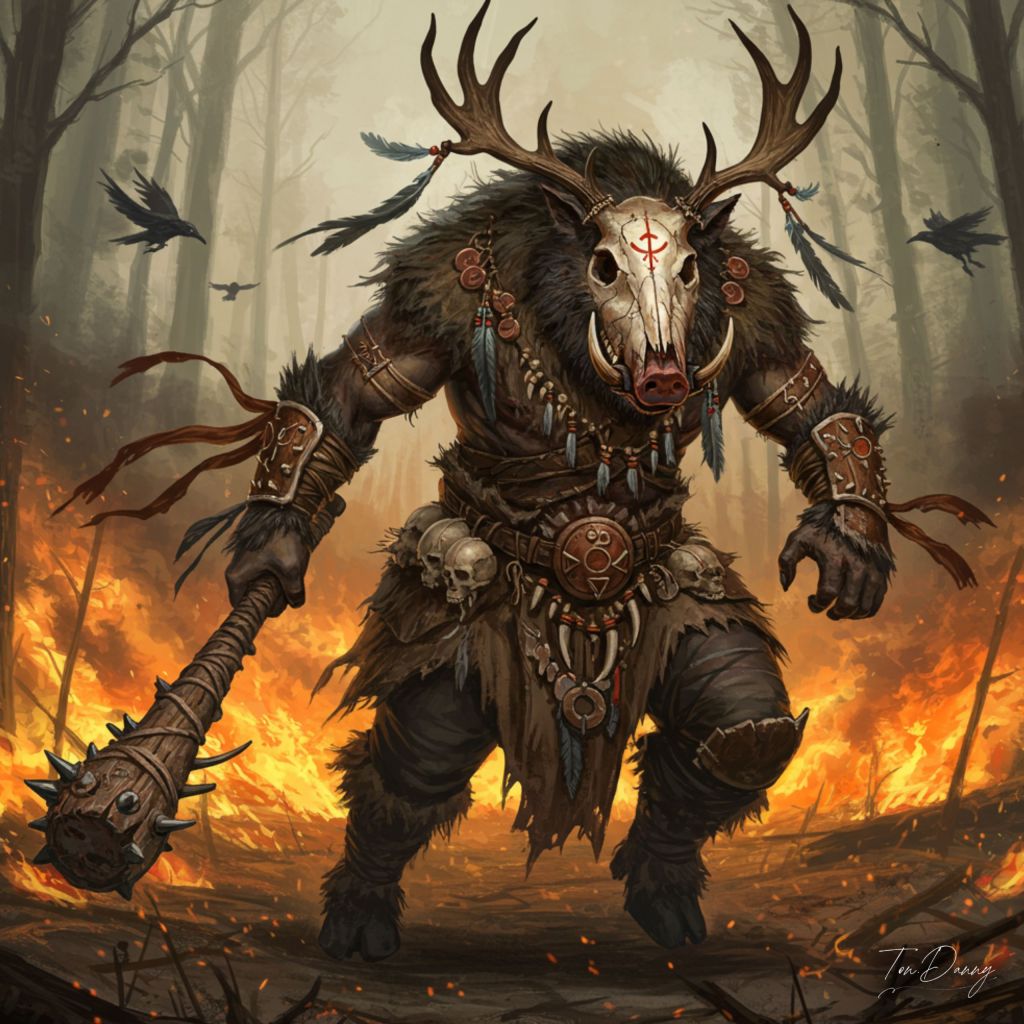 “Oil painting, Soul-like Eastern style, Dark fantasy atmosphere. A colossal, thickly furred boar-beast, his body bristling with coarse, soot-dark hair matted by ash and blood, charges through a blaze-ravaged woodland. His torso and limbs are layered in tribal armor of charred bark, bone plating, and sacred bronze, bound by sinew and decorated with ceremonial beadwork, feathered cords, and weathered totem sigils. Each motion sends charms and leather streamers whipping through the smoke. His waist is cinched with a broad war-belt of antler splinters and copper discs, from which hang tassels of dyed sinew, raven feathers, and fang-carved talismans. Draped over his massive shoulders is a bear-pelt cloak, heavy with ritual smoke and stitched with sun-glyphs and ancestral war patterns. The cloak sways like the banner of a forgotten god. His snarling mask, a cracked and flame-scorched boar skull, is crowned with blazing antlers wrapped in braided fetishes—glowing with a cursed fire that never consumes. In both hands, he wields a titanic war club, carved from the petrified heartwood of a fallen world tree. The club is nearly as tall as he is, its haft wrapped in runic bands and the head bound with scorched skulls, iron brands, and bone spikes. Each step he takes sends tremors through the burning soil. He does not swing to kill. He swings to erase. Behind him, birds fall dead. Ahead, even fire gives way. He is not warrior nor beast— He is the stampede of ancestral vengeance. He is the drumbeat of the forest’s wrath.”