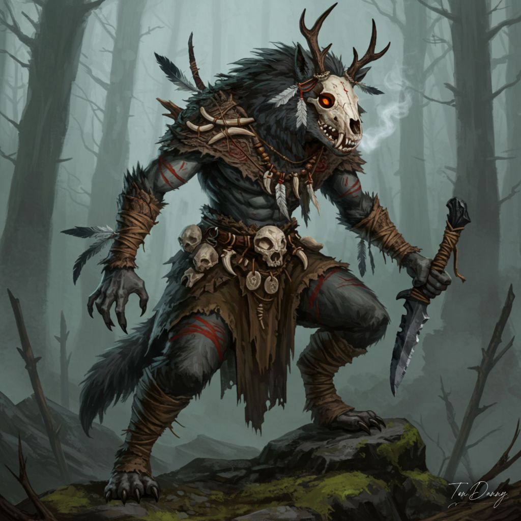 “Oil painting, Soul-like Eastern style, Dark fantasy atmosphere. A towering wolf-beast stands crouched atop a moss-blackened boulder, his body a tapestry of corded muscle and ritual scars, wrapped in bark-woven armor and plated with bone. His ash-colored fur is thick and tangled with spirit beads, feathered charms, and fangs etched with ancestral runes. Each breath is heavy, steaming in the cold mist, coiling around him like a spirit awaiting command. Across his broad shoulders flows a mantle of dark bear hide, stitched with crow feathers, red-dyed talismans, and leather strips scorched with sun-mark sigils. At his waist sway carved bone fetishes and totemic claws, clinking softly with every shift of his stance. His feet are planted wide—not in rest, but in readiness. His mask is a bleached wolf skull—splintered at the jaw, its fangs exposed, and antler fragments lashed to the crown. From beneath it, amber eyes burn with ancestral fury. In his hand, he grips a jagged obsidian ritual knife, crude and primal, its serrated edge bound to a blackwood handle with sinew and twine. It is no ceremonial relic. It is his oath. Behind him, a warped totem of bone, claw, and antler rises like a crooked monument—not a shrine, but a warning. He does not howl. He does not stalk. He waits—poised in silence— for the trespasser who dares breathe first.”