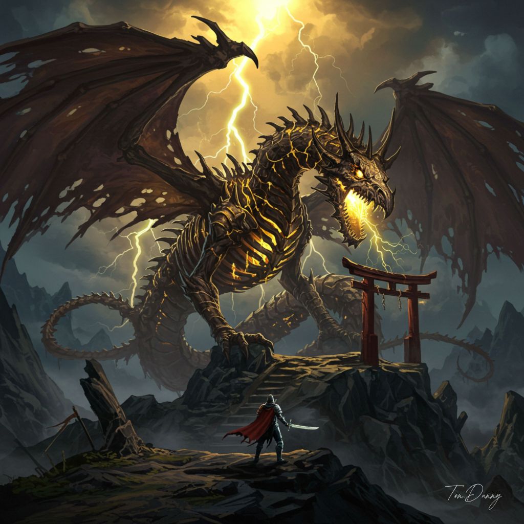 “Oil painting, Soul-like Eastern style, Dark fantasy atmosphere. A skeletal dragon king wreathed in black and gold lightning coils around a ruined shrine at the peak of a stormy mountain. Its massive wings are torn but still radiate raw power, and its roaring maw releases arcs of energy that crackle through the air. A lone warrior stands defiantly before it, wielding a blade that mirrors the dragon’s lightning.”