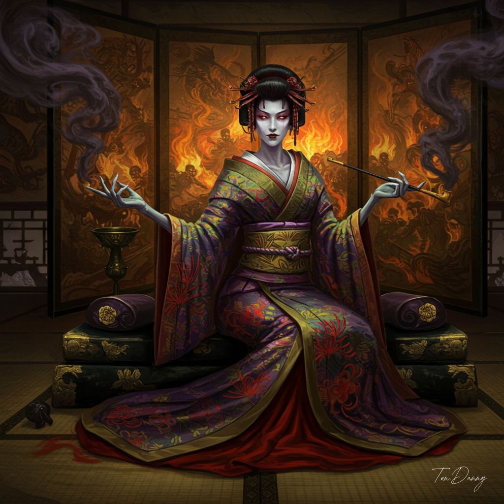 “Oil painting, Soul-like Eastern style, Dark fantasy atmosphere. A ghostly courtesan with skeletal hands sits on an ornate black and gold tatami. She wears a vibrant yet tattered kimono adorned with glowing red spider lilies. Her eyes burn with an unnatural fire, and she holds a long pipe that emits dark, swirling smoke. Behind her, a massive folding screen depicts scenes of chaos and fire.”