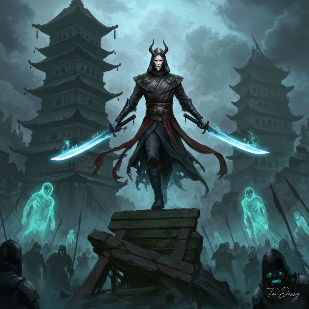 “Oil painting, Soul-like Eastern style, Dark fantasy atmosphere. A ghostly dual-wielding assassin cloaked in flowing black silk stands atop a crumbling pagoda. Their twin blades glow with a pale blue light, and their mask resembles a demon’s visage. Below them, spectral warriors rise from the ruins, ready to obey their silent command.”