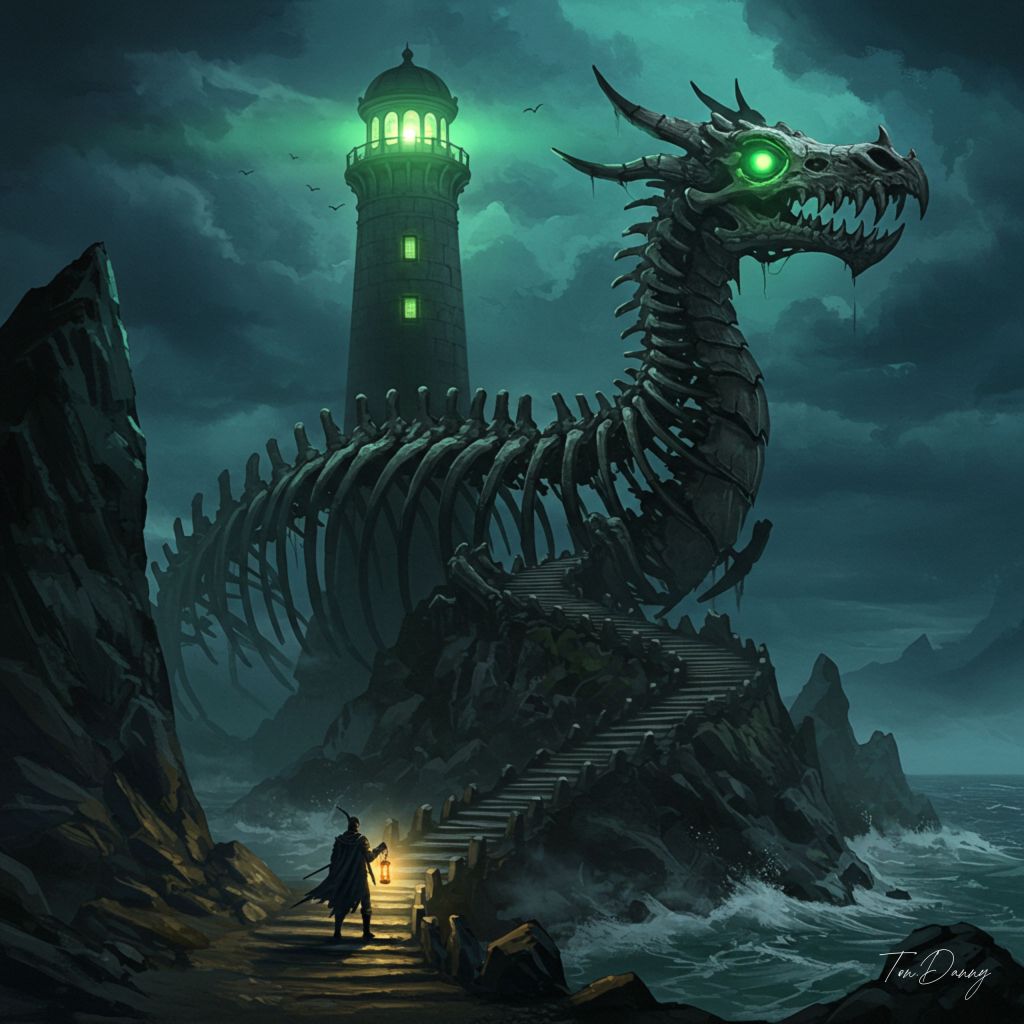 “Oil painting, Soul-like Eastern style, Dark fantasy atmosphere. A colossal lighthouse shaped like a dragon’s skeleton rises from the jagged cliffs of a desolate shore. Its eyes emit an eerie green light that pierces through the stormy night. A lone figure, clad in tattered black armor, ascends the winding staircase carved into the dragon’s spine, holding a lantern that flickers with ghostly fire.”