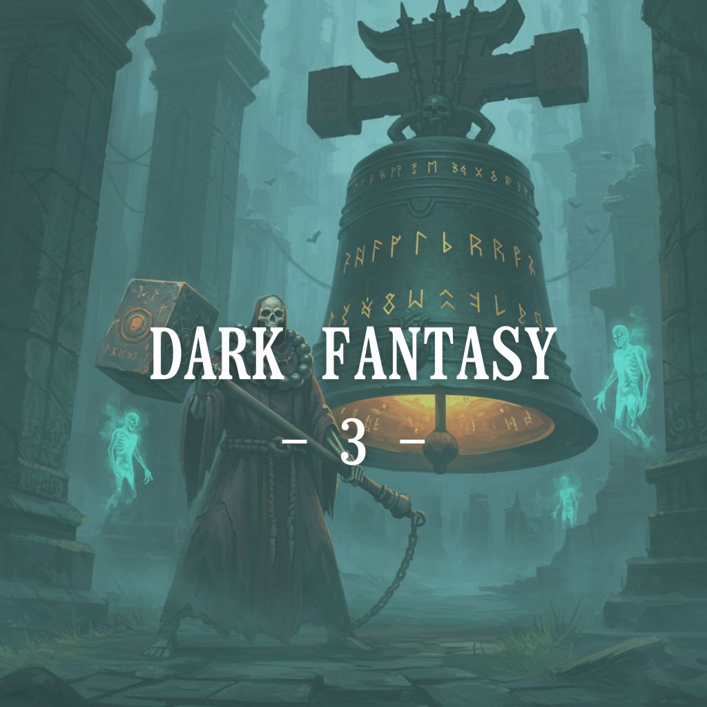 “Oil painting, Soul-like Eastern style, Dark fantasy atmosphere. A towering skeleton in ancient monk’s robes guards an enormous bell covered in glowing runes. The skeleton holds a massive hammer, and the faint sound of the bell’s chime echoes through the misty ruins of a temple. Each toll seems to summon lost souls, their forms shimmering in the fog.”