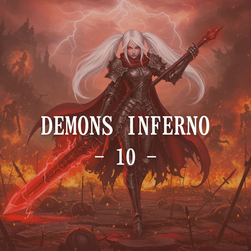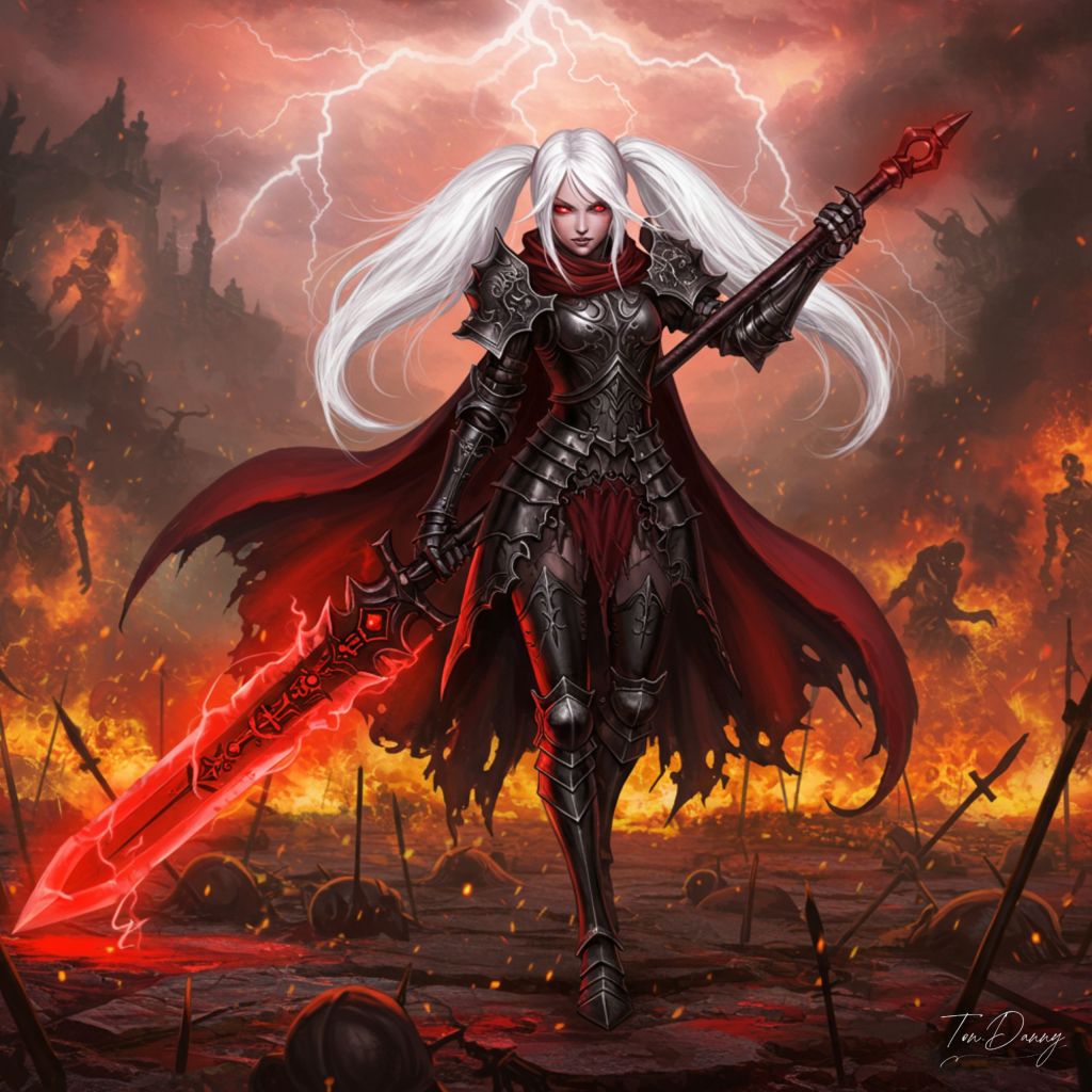 Oil painting, Soul-like Eastern style, Dark fantasy atmosphere in a battlefield of fire and shadow. A tall, white-haired warrior maiden with flowing twin tails advances through the infernal wasteland, her crimson eyes burning with cold, merciless intensity. Her skin is ghostly pale, drained of all warmth, as if untouched by life itself, making her appear like a spectral reaper woven from darkness and fire. She wears gothic black armor, adorned with intricate cursed sigils, its dark plating accentuating her graceful yet battle-hardened physique. A tattered crimson cloak billows behind her, scorched and torn by endless battles, whispering in the wind like the remnants of a forgotten oath. She wields a massive, blood-red greatsword, nearly as tall as she is, its jagged blade pulsing with molten energy. Holding the hilt with both hands, she effortlessly maneuvers the colossal weapon, her movements like a dancer entwined with destruction. One hand grips the handle firmly, while the other lightly supports the base, guiding each swing with an eerie, effortless grace. The blade cuts through the air like a crimson storm, leaving behind arcs of searing red light, each strike laced with raw, devastating power. The battlefield is a smoldering wasteland of shattered weapons and scorched corpses, the ground quaking beneath a sky swirling with crimson lightning. Spectral warriors flicker in the distance, their forms writhing in the abyss, drawn to the chaos she leaves in her wake. The air is thick with embers and whispers of the damned, as if reality itself holds its breath before the storm she is about to unleash. She is the executioner, the demon’s knight, her movements both terrifying and mesmerizing. As the embers rise around her, she glares forward with unwavering resolve, her greatsword dancing through the flames like an extension of her very soul—an unstoppable force of destruction, carving fate itself into the abyss.