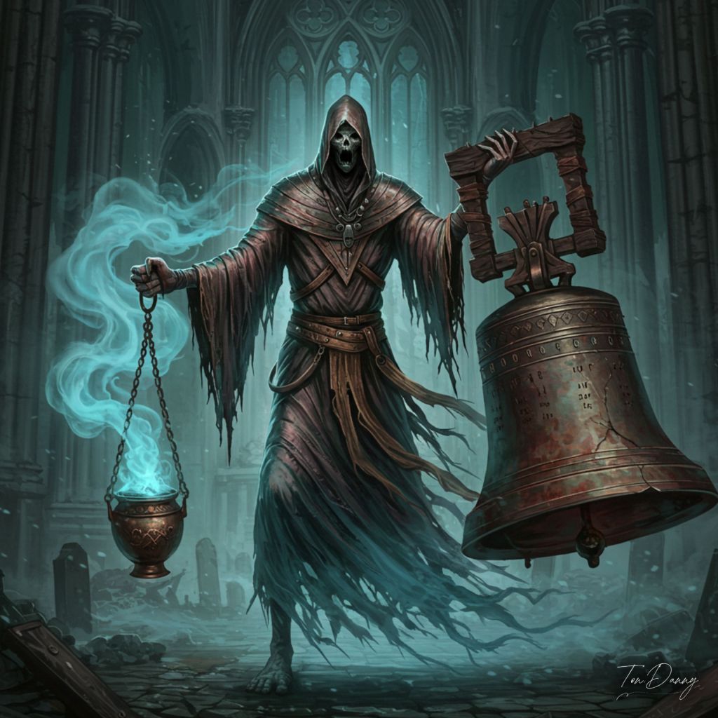 “Through the twisted remnants of a ruined cathedral, a tattered specter drifts, its form wrapped in decayed funeral robes, their fabric moving as if caught in an unseen tide. No face exists beneath its hood—only a yawning, endless void, from which whispers of the dead endlessly murmur. In one skeletal, elongated hand, it clutches a towering censer, rusted and blackened with age, from which a spectral blue mist coils. In its other hand, it bears a colossal, shattered bell, its surface engraved with prayers for the long-dead, its cracks weeping with an oily, black liquid. With each slow, deliberate step, the bell tolls without sound, and yet all who hear it feel their souls tremble, as if standing on the precipice of their own graves. The mist trails behind it, writhing and stretching like the grasping arms of the forgotten, seeking warmth, seeking life. The air around it is thin, suffocating, as if reality itself cannot bear its presence. Those who linger too long within its shadow do not perish—they simply cease, their existence fading as if they were never there. It does not judge. It does not curse. It simply rings the bell of oblivion, one soul at a time.”