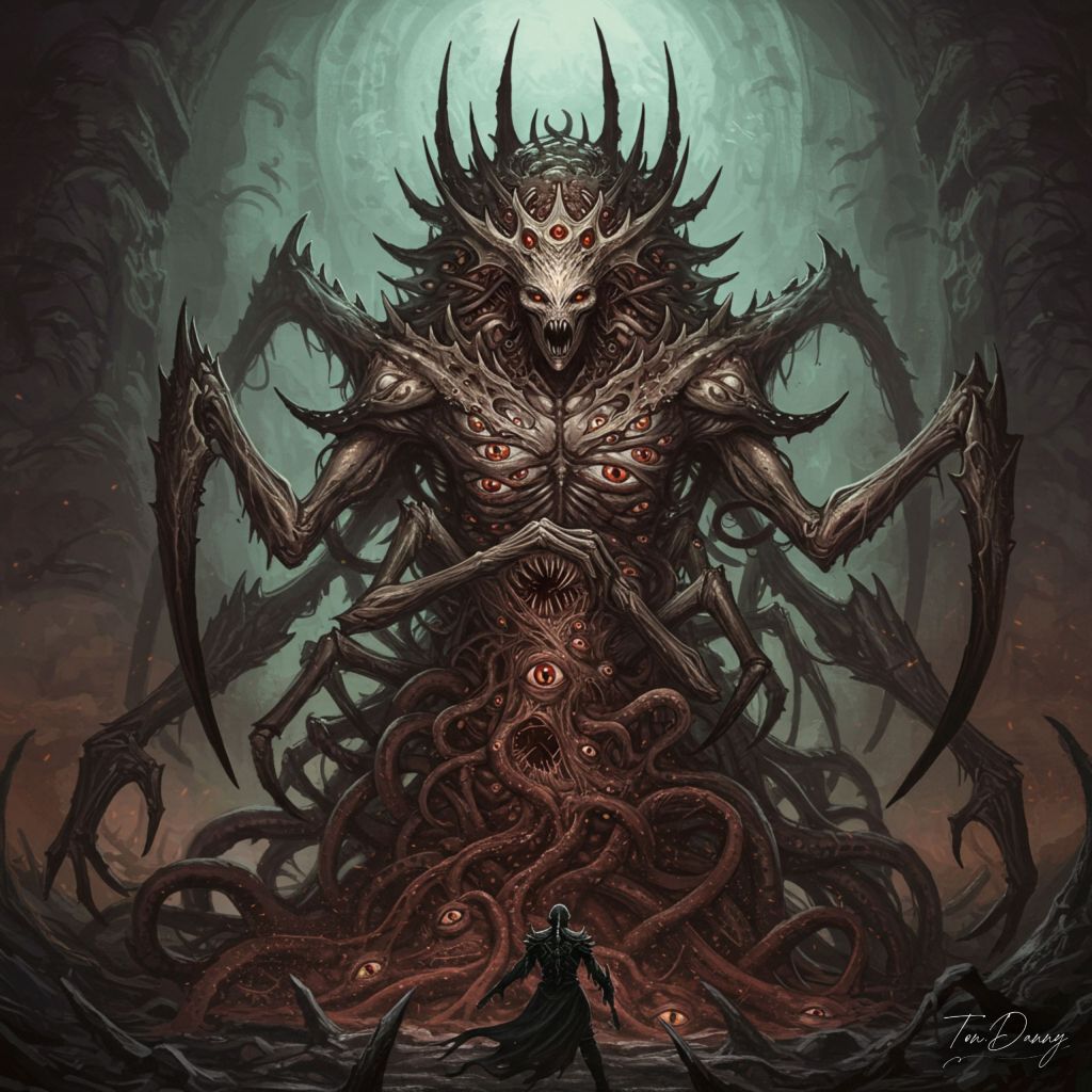 “Beyond the veil of mortal reality, where space collapses and time twists upon itself, an unspeakable hunger writhes—a colony of consciousness, a hivemind of devouring horror. The Abyssal Devourer does not exist as a singular being. It is a swarm, an ever-shifting mass of chitinous, many-eyed horrors, their bodies woven together into an ever-mutating, grotesque titan. Its form constantly reconfigures, limbs folding into itself, only to sprout anew—some resembling the mandibles of an impossibly large insect, others warped and jagged, like the claws of a beast that has never been born. Its crown is no mere ornament, but a writhing halo of twitching, needle-thin appendages, each ending in a single, blinking eye that sees across dimensions. Beneath it, the ground does not simply crack—it dissolves, reality itself unraveling as the creature consumes not just matter, but the very idea of solidity. Those who gaze upon it too long find themselves losing cohesion, their bodies fragmenting into the swarm, becoming one with the ever-growing mass. It does not hunt. It does not pursue. It simply expands, and in time, all things will be devoured.”