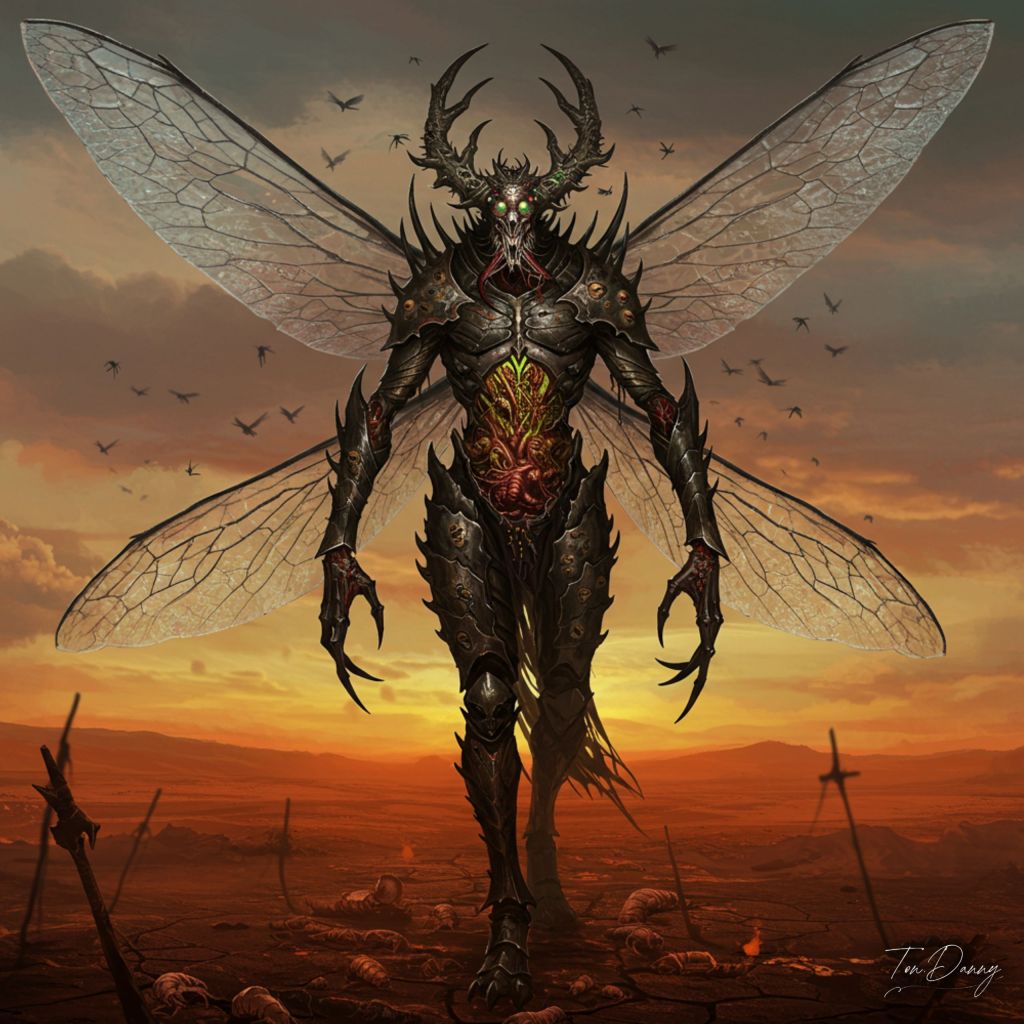 “Where plague-ridden winds howl across the scorched desolation of the infernal wastes, a towering figure descends from the sky—a god of ruin and decay, known only in whispered curses as the Profane Locust Deity. Unlike the swarming masses it commands, this blasphemous being takes the shape of a towering humanoid silhouette, twisted and insectoid in nature. Its elongated limbs, plated in obsidian chitin, bend in unnatural angles, ending in razored, clawed fingers that click and twitch with ravenous energy. Its torso is broad yet warped, pulsing with internal swarms, the seams of its carapace splitting open intermittently, releasing bursts of pestilent mist and parasitic locusts that scatter into the wind. From its back, four massive, translucent wings extend outward—webbed membranes glistening with pus-like veins, within which thousands of writhing larval shapes pulse and twitch. Each wingbeat generates a mind-breaking drone, a sonic plague that infects thoughts and erodes the will. Its head is a grotesque fusion of humanoid skull and insectoid monstrosity—elongated mandibles extend from where a jaw might have been, twitching and gnashing constantly, while its face is dominated by clusters of glimmering, multifaceted eyes, each one reflecting distorted, screaming faces of its past victims. Atop its brow, a crown of living locusts writhes endlessly, feeding on the ichor that seeps from its cracked exoskeleton. It walks with an unholy grace—tall, slow, and deliberate, yet with each step, the earth blackens and splinters beneath its talons. Where its shadow passes, the air rots, the ground crawls with micro-swarms, and reality itself seems to wither away. It does not shout. It does not roar. Its very presence summons disease and delirium, and those who look upon it too long feel their skin crawl and their minds unravel. This is no beast. This is no swarm. This is a god of pestilence incarnate—walking, devouring, ascending.”