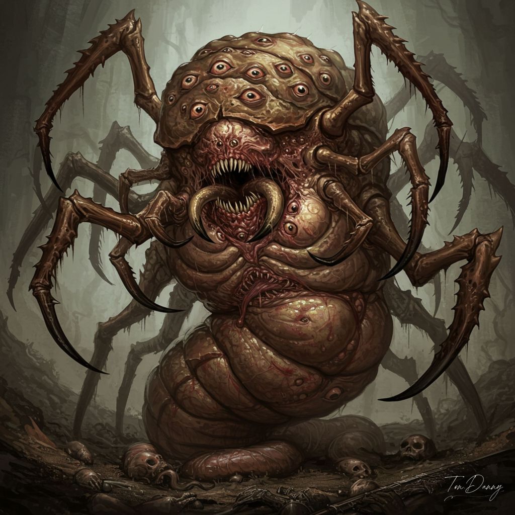 “Beneath the charred crust of a long-forgotten underworld, something stirs—something that should never be unearthed. The Hundred-Eyed Burrowing Horror is no single entity, but a writhing, pulsating mass of chitin and limbs, endlessly twisting, endlessly expanding. Its torso is a swollen, grotesque carapace, its surface lined with unblinking, lidless eyes, each one staring in different directions, watching, hunting, hungering. Its limbs are segmented, resembling those of a monstrous centipede fused with a demonic beast, each one ending in serrated pincers that twitch and snap at unseen prey. Some of its arms split apart mid-joint, unfurling into clusters of writhing, barbed appendages, their ends dripping with caustic bile that melts flesh on contact. Its face is an atrocity—a gaping vertical maw, its insides lined with rotating, drill-like teeth, churning ceaselessly. Mandibles jut from the sides of its head, opening and closing with unnatural precision, their sharp tips clicking together like a perverse mockery of speech. It does not pursue—it erupts from beneath, dragging entire legions into the abyss. The ground is not solid in its presence. It is a feeding ground.”