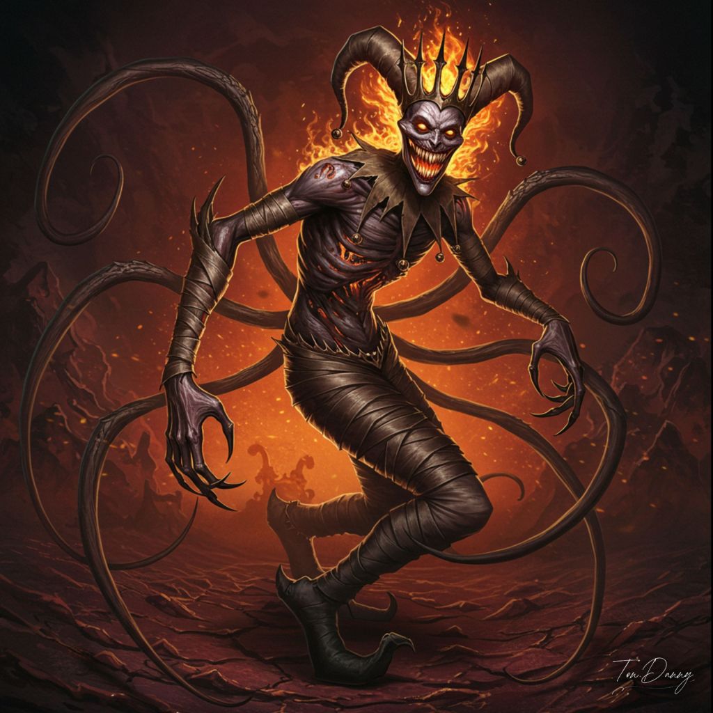 “From the depths of the eternal inferno, where the screams of the tormented rise in a twisted chorus, a mockery of existence emerges—the Infernal Jester, a cruel and sadistic harbinger of insanity. His twisted, elongated body is wrapped in burning tatters, his flesh a cracked, blackened husk, eternally aflame. His arms are unnaturally long, ending in jagged, clawed fingers that twitch with anticipation. His mouth stretches impossibly wide, filled with rows of needle-like teeth, his grin locked in a permanent rictus of malicious glee. His head is adorned with a grotesque, jagged crown, its shape shifting and warping as if mocking the very concept of royalty. Fiery tendrils coil around his body, flickering and whipping like the restless limbs of something unseen. From his back, curved, spindly limbs emerge, like marionette strings without a puppeteer, each one tipped with razor-like hooks. His laughter is not sound—it is an infection, a creeping madness that seeps into the minds of all who hear it, twisting their perception of reality. The ground beneath him buckles and warps, shifting into ever-changing patterns, as if the very fabric of Hell itself cannot bear his presence. He does not kill out of hunger. He kills for amusement. And when he laughs, Hell itself quakes.”