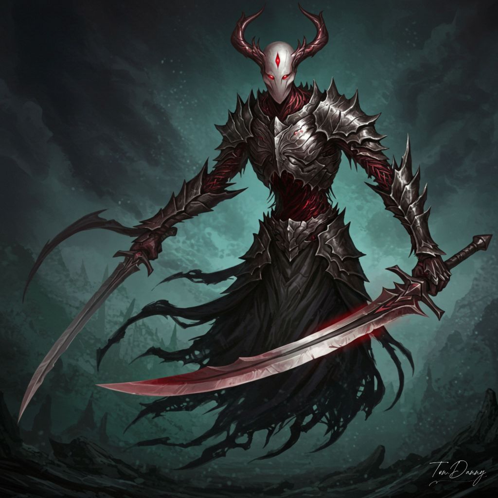 “From the darkest corners of the forgotten world, where no sun has ever risen, something sharpens itself against the void. A twisted specter of steel and malice, its form is not flesh, but a living collection of jagged blades, each one etched with the memories of those it has slain. Its limbs are a tangled nest of cutting edges, bladed tendrils that coil and lash like the serrated wings of a predator too fast for the eye to follow. Its face is no face at all, but a gleaming, featureless helm, its only marking a thin, glowing rift of deep crimson, an ever-watching gaze that never blinks, never wavers. It does not move as living things do—it flickers, appearing where the next strike has already landed. The air distorts around it, slashed apart before it ever arrives. Its prey does not see its blade. They only see their wounds, deep and fatal, before they realize they have already fallen. It does not chase. It does not stalk. It simply moves, and death follows.”