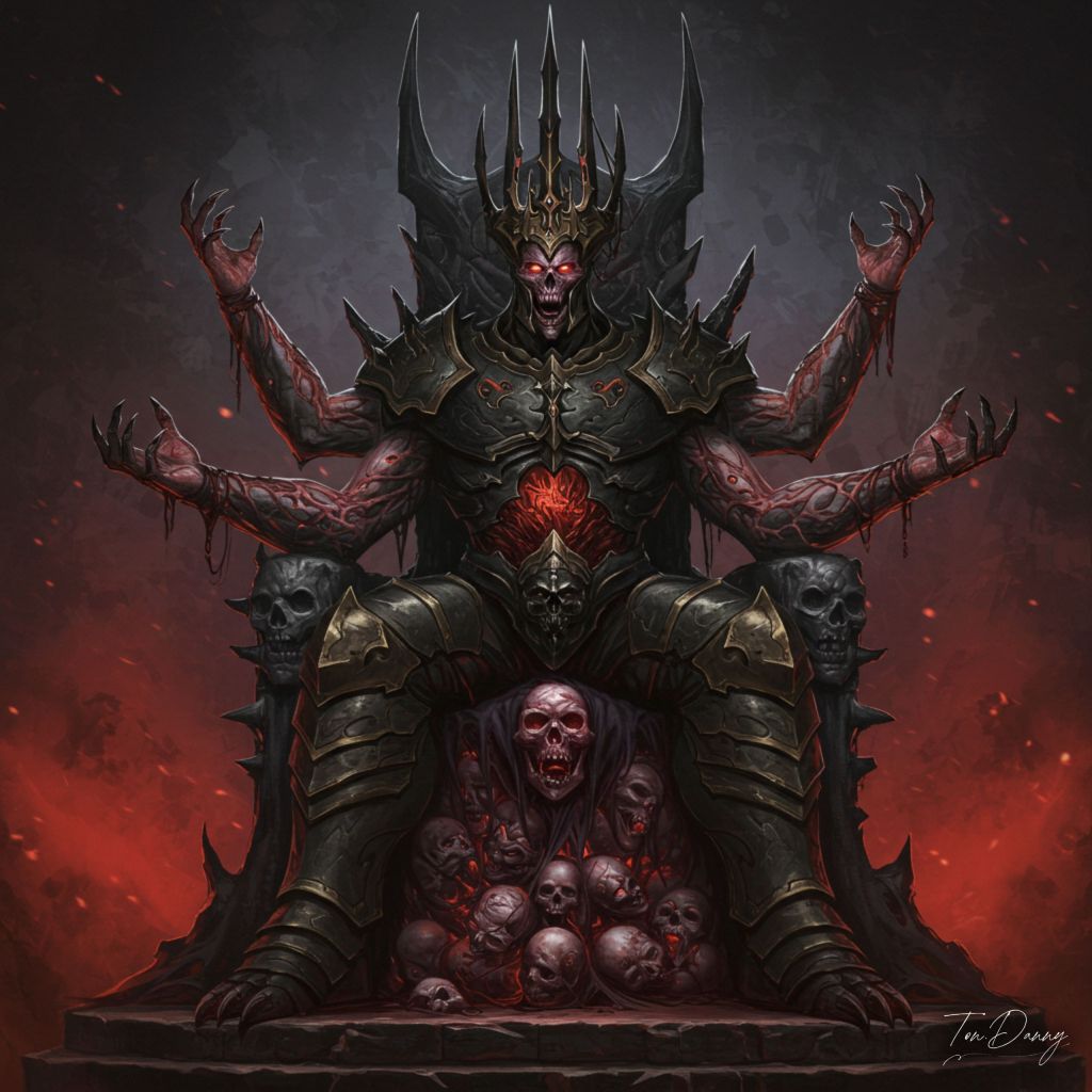 “At the blackest pit of the underworld, where even demons fear to tread, a king sits upon a throne of writhing bodies, his presence alone warping reality into madness. The Doom Monarch is not a mere ruler. He is the essence of annihilation, his body a monument of grotesque perfection, covered in layered plates of living obsidian, his flesh breaking apart and reforming in constant agony. His crown is fused to his skull, a jagged mass of tortured, clawing hands, each one grasping at something unseen, trying desperately to escape. His four massive arms bear no weapons, for he is destruction incarnate. Each gesture distorts the world, his fingers leaving deep, burning scars upon the air itself. Where he walks, land becomes ash, and where he gazes, existence itself crumbles. His voice is a plague, his words rewrite the laws of the cosmos, twisting fate, breaking souls, unraveling the minds of those who dare to listen. He does not need an army—his presence alone is the end of all things.”