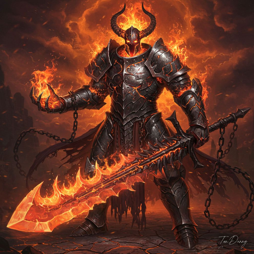 “At the heart of a burning cataclysm, where the sky is nothing but an ocean of writhing fire and the ground cracks beneath the weight of eternal judgment, the Infernal Adjudicator stands, a monolithic executioner of the damned. His body is a grotesque fusion of molten iron and charred bone, his armor blackened and cracked, seething with embers that refuse to die. His face is absent, replaced by a floating, molten sigil, a burning glyph of judgment that shifts and twists with every sentence he delivers. Flaming chains coil around his limbs, searing his form, yet binding him to his eternal duty. In his gauntleted grip, he wields a monstrous, two-handed greatsword, its blade formed from the fused bones of countless condemned souls, their faces still visible, their mouths silently screaming as their agony fuels his blade’s insatiable hunger. With every swing, gouts of spectral fire erupt, scorching not just flesh, but the very concept of existence itself. Above him, the sky churns with burning sigils, each one marking another name to be erased from history. The air chokes with the wails of the forsaken, and as he moves, the ground itself is branded with his passing, leaving nothing behind but scorched ruin. He does not pass judgment from choice—he is judgment itself.”